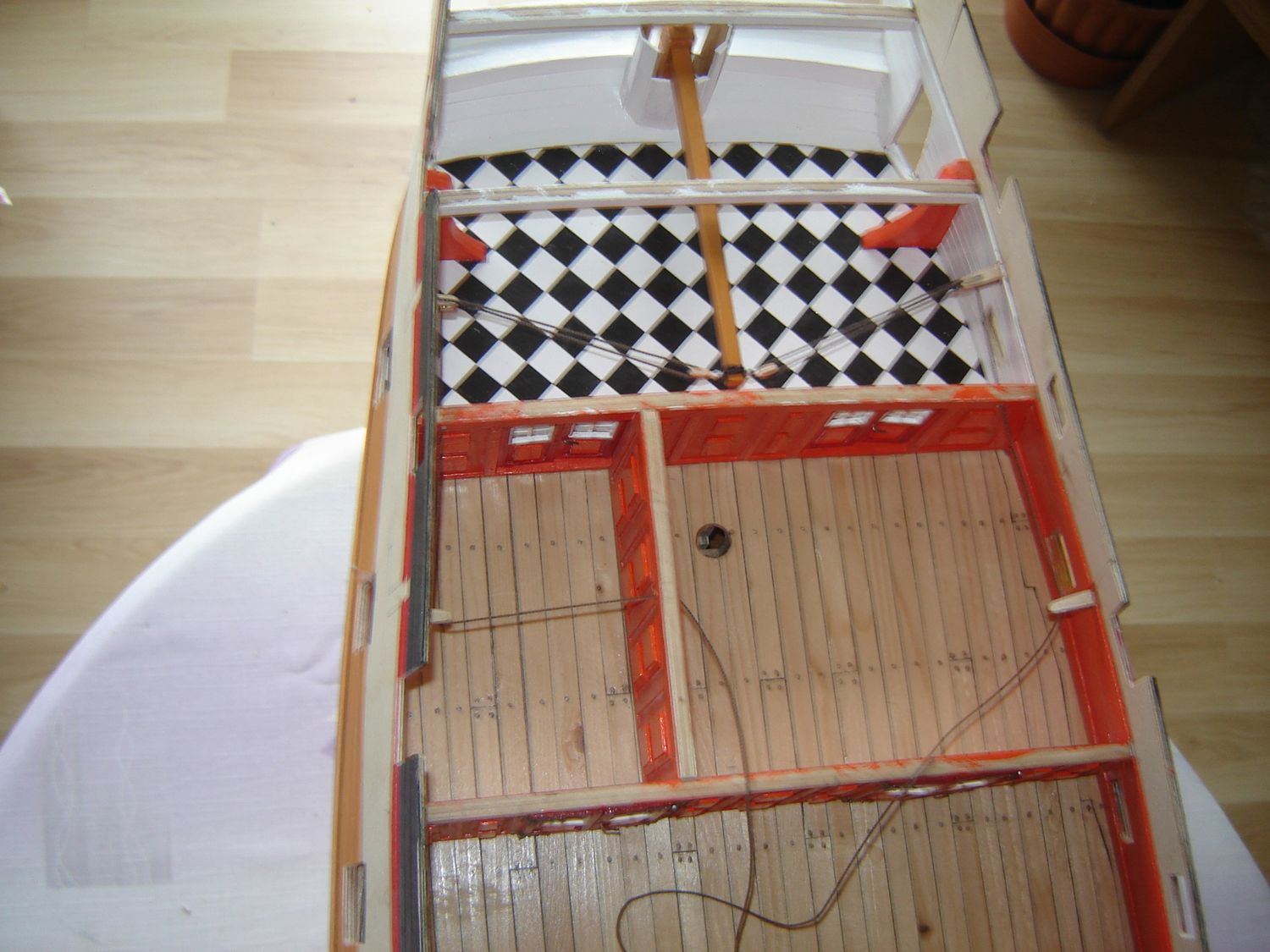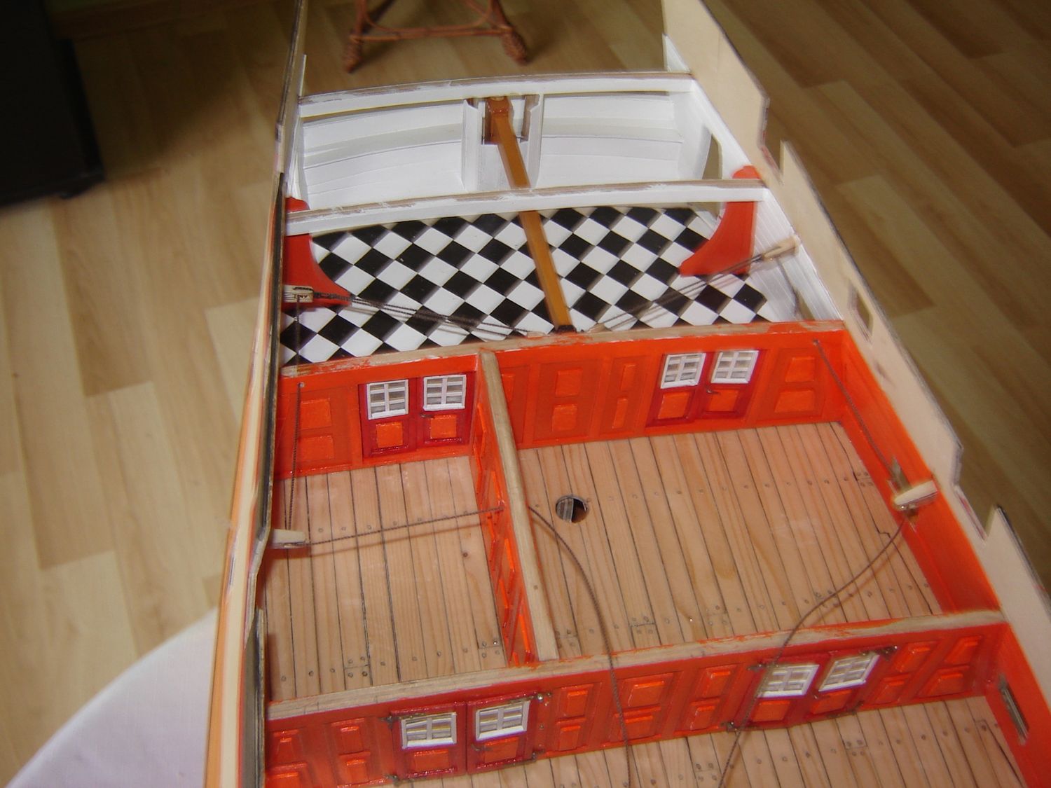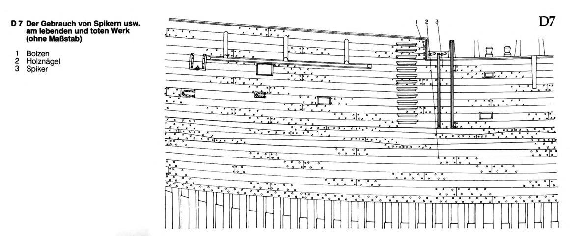 - Słoje pokładu zlewają się ze słojami czopa i z pewnej odległości są niewidoczne.Wykonanie z bambusa czy jakiegoś metalu jest niewłaściwe.Co innego gwoździowanie.Całą burtę dosyć gęsto pokrywano stalowymi gwoździami .Rdza z wapnem,siarką i innym świństwem tworzyła powłokę ochronną przed świdrakami.W modelach raczej takiego gwoździowania nie pokazujemy.