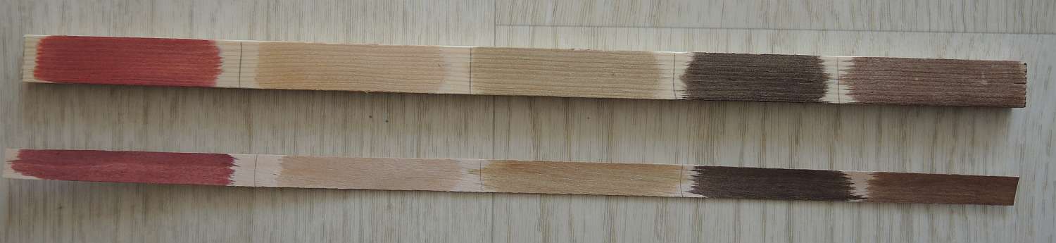 Odcienie bejcy od lewej: mahoń, buk, sosna, orzech, dąb