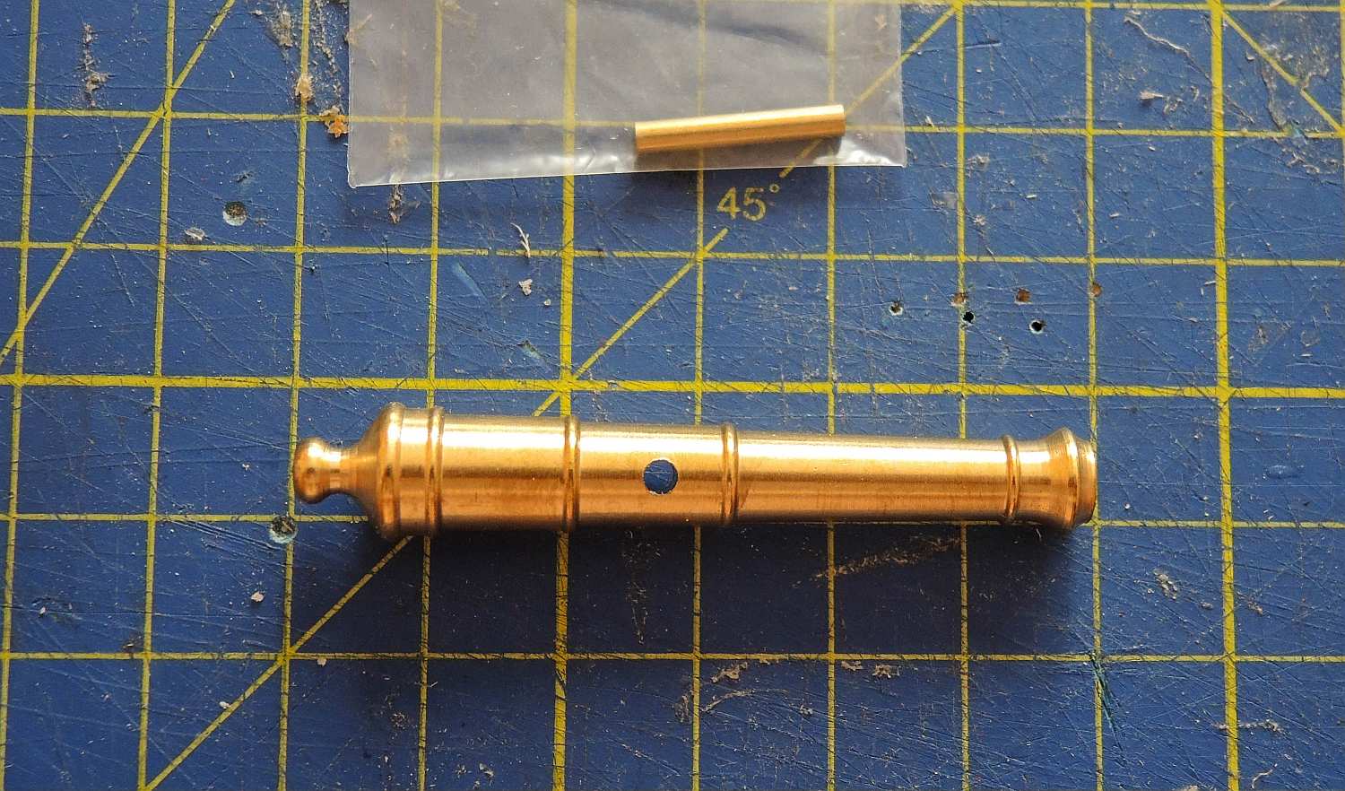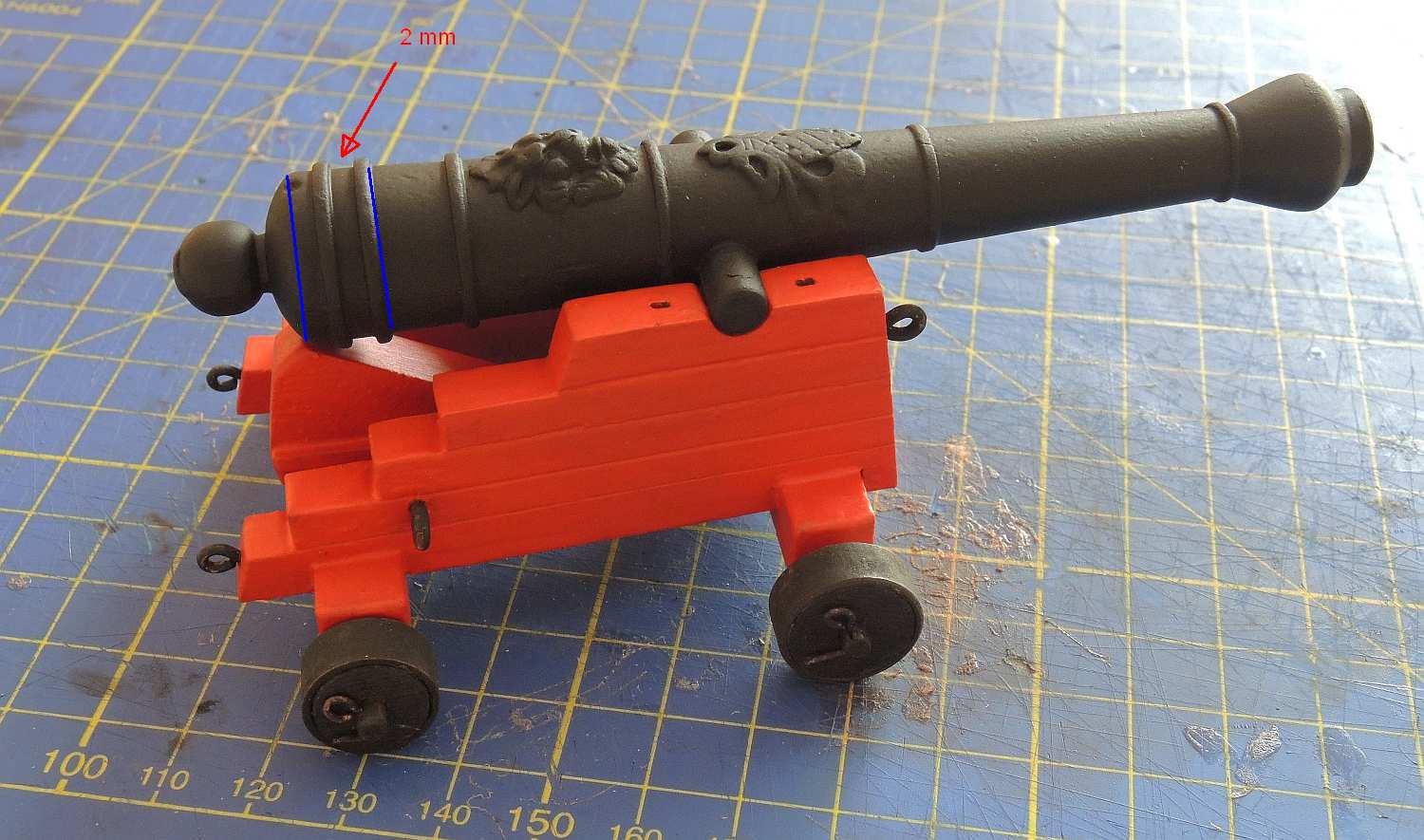 Może udałoby się wyciąć z cienkiej folii aluminiowej taki kształt i go nakleić na działo klejem CA (a ten zestawowy otwór wypełnić klejem czy zalutować), po czym poczernić całość farba albo czernidłem?