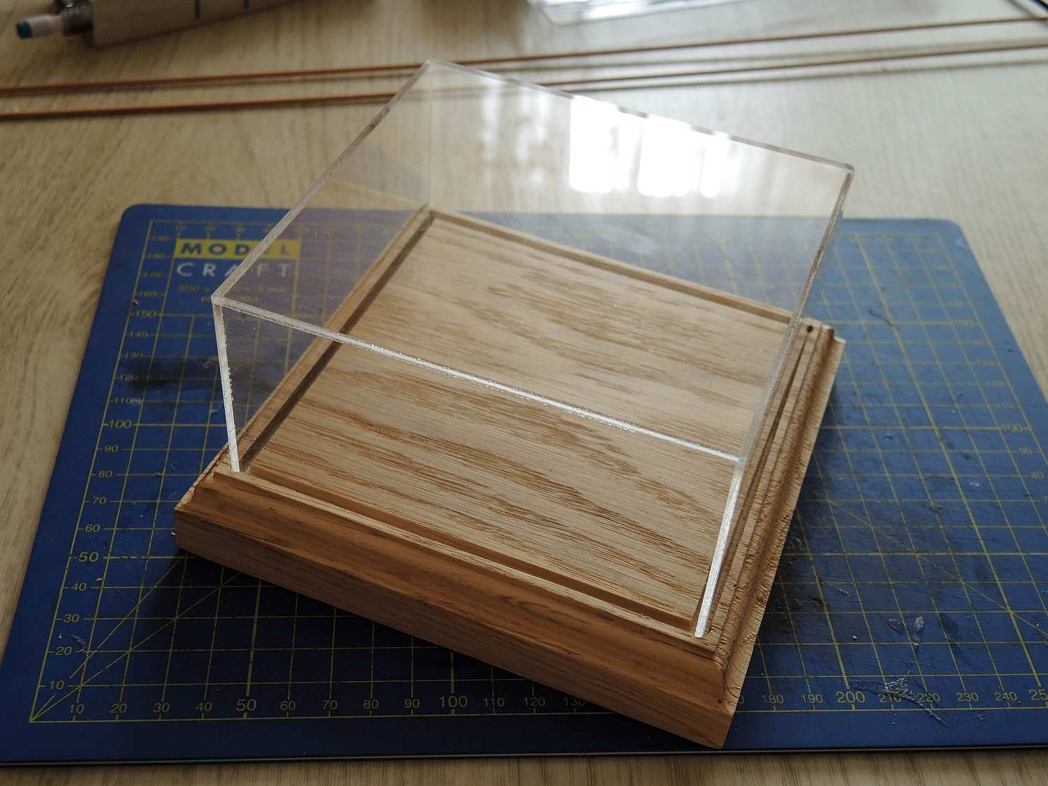 Podstawka o wymiarach 15x15 cm. Wysokość gablotki ok. 6,5 cm.