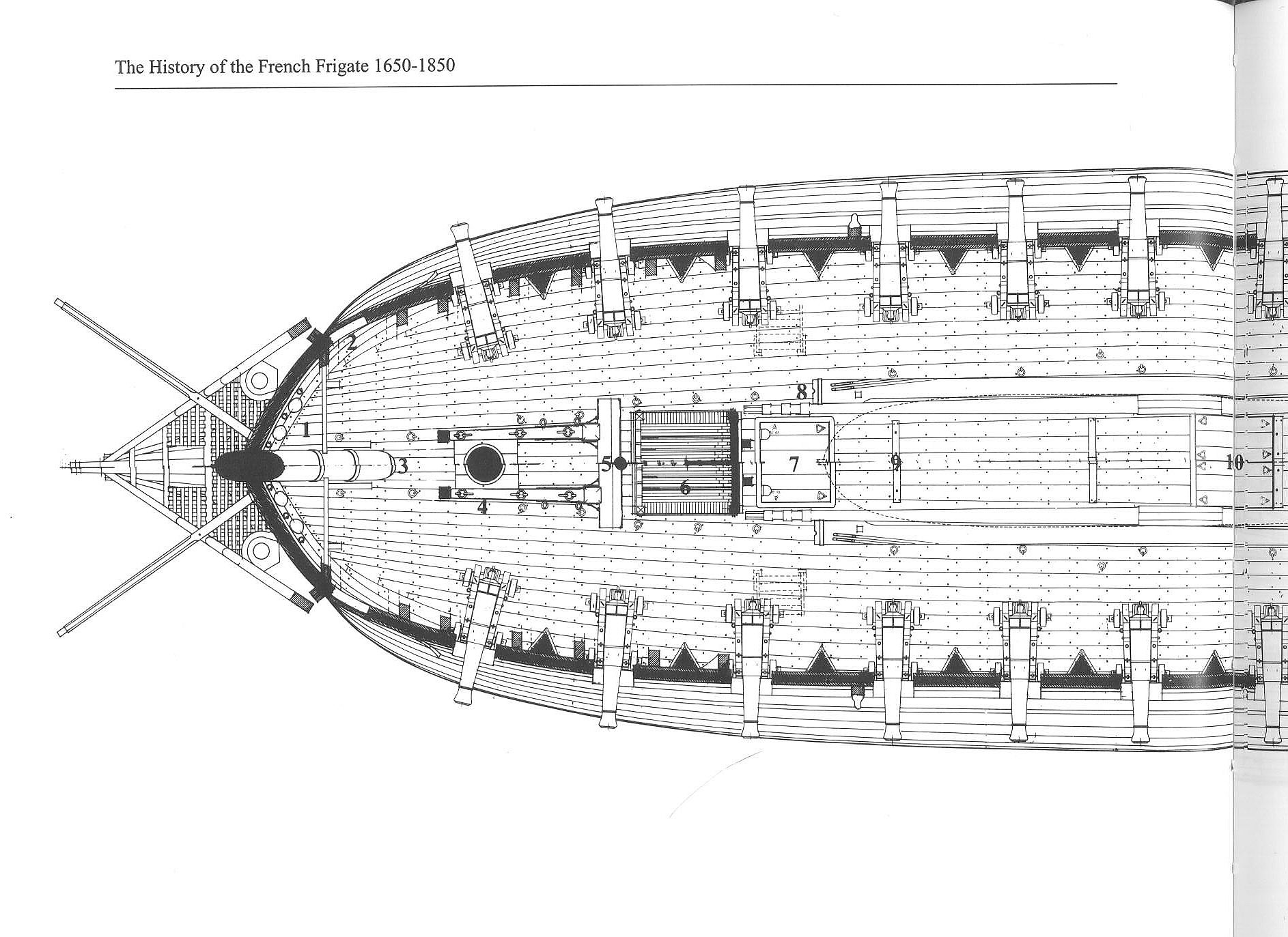 Raczej, jak to bylo praktykowane w British Royal Navy - gdzie deskowanie pokladow bylo w linii prostej, wzdluz dlugiej osi kadluba, Francuzi lubili komplikowac wszystko, i takze swe poklady poszywali deskami biegnacymi lukowato wzdluz krzywizny przy wnetrzu burt. W srodkowej osi kadluba ostatnie deski biegly juz wzdluznie, wiec istnieje koniecznosc profilowania kazdej z planek (metoda podobna do profilowania poszycia burtowego, tj. podziel sobie caly poklad na szereg segmentow liniami poprzecznymi do dlugiej osi, pobierz dlugosci tych linii i podziel kazda linie na liczbe odpowiadajaca ilosci planek. Otrzymasz szerokosci planek dla kazdej z tych linii. Teraz tylko wystarczy przeniesc te odcinki na kazda z planek, pozaznaczac olowkiem punkty, polaczyc je krzywka szkutnicza i wyprofilowac kazda planke wzduz tej linii.
