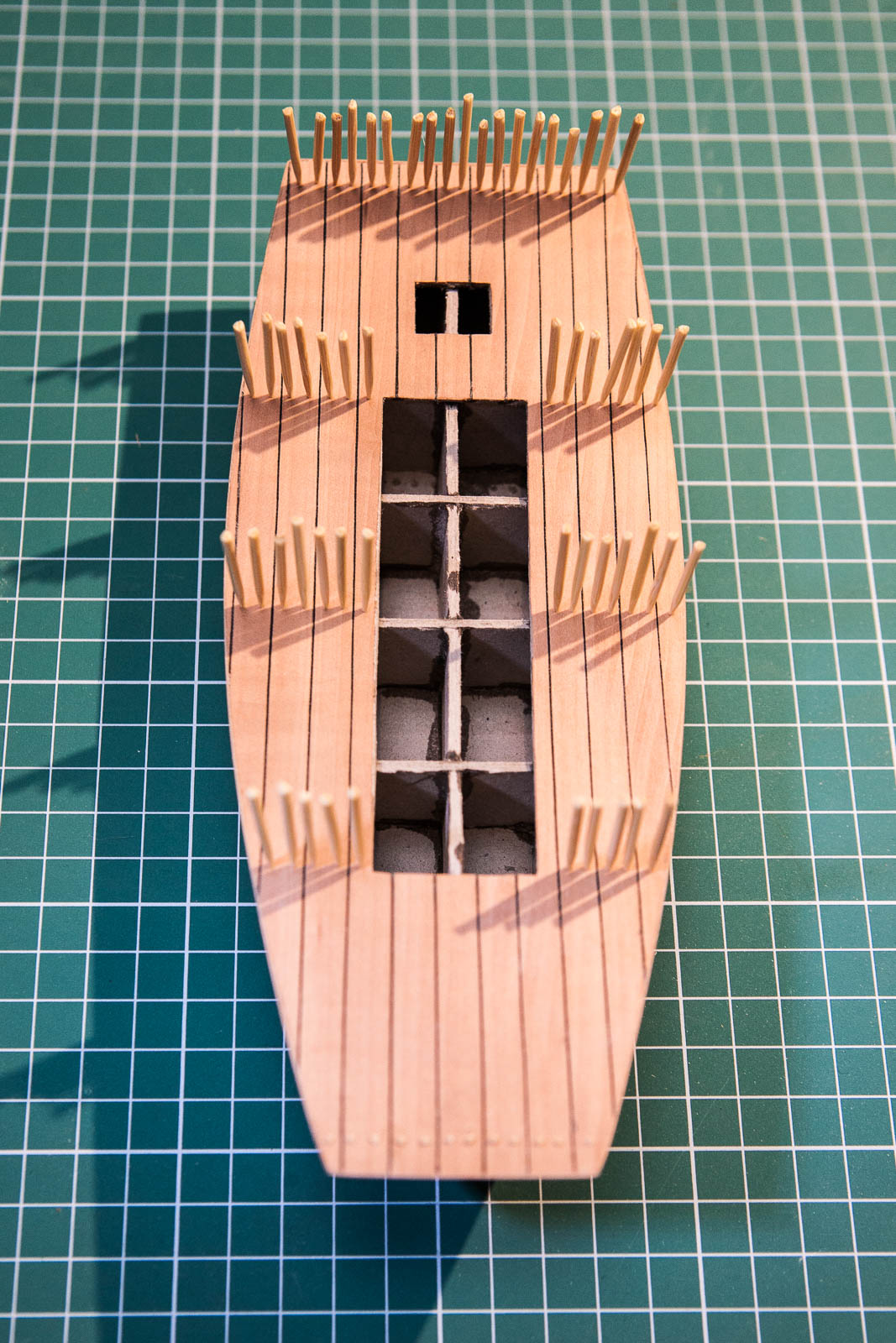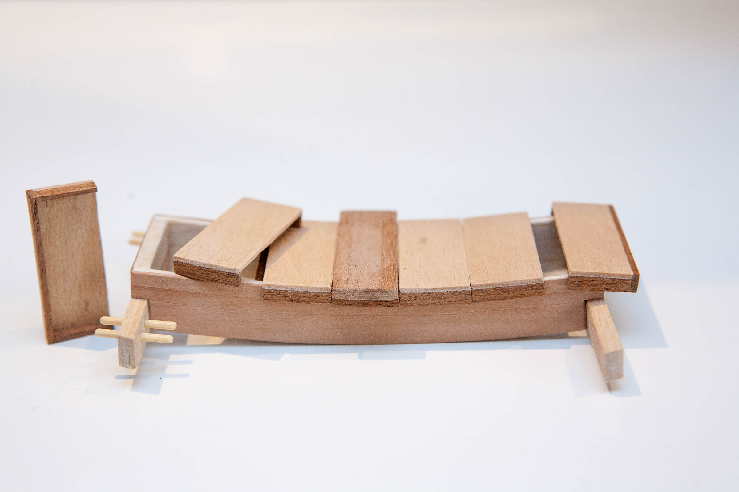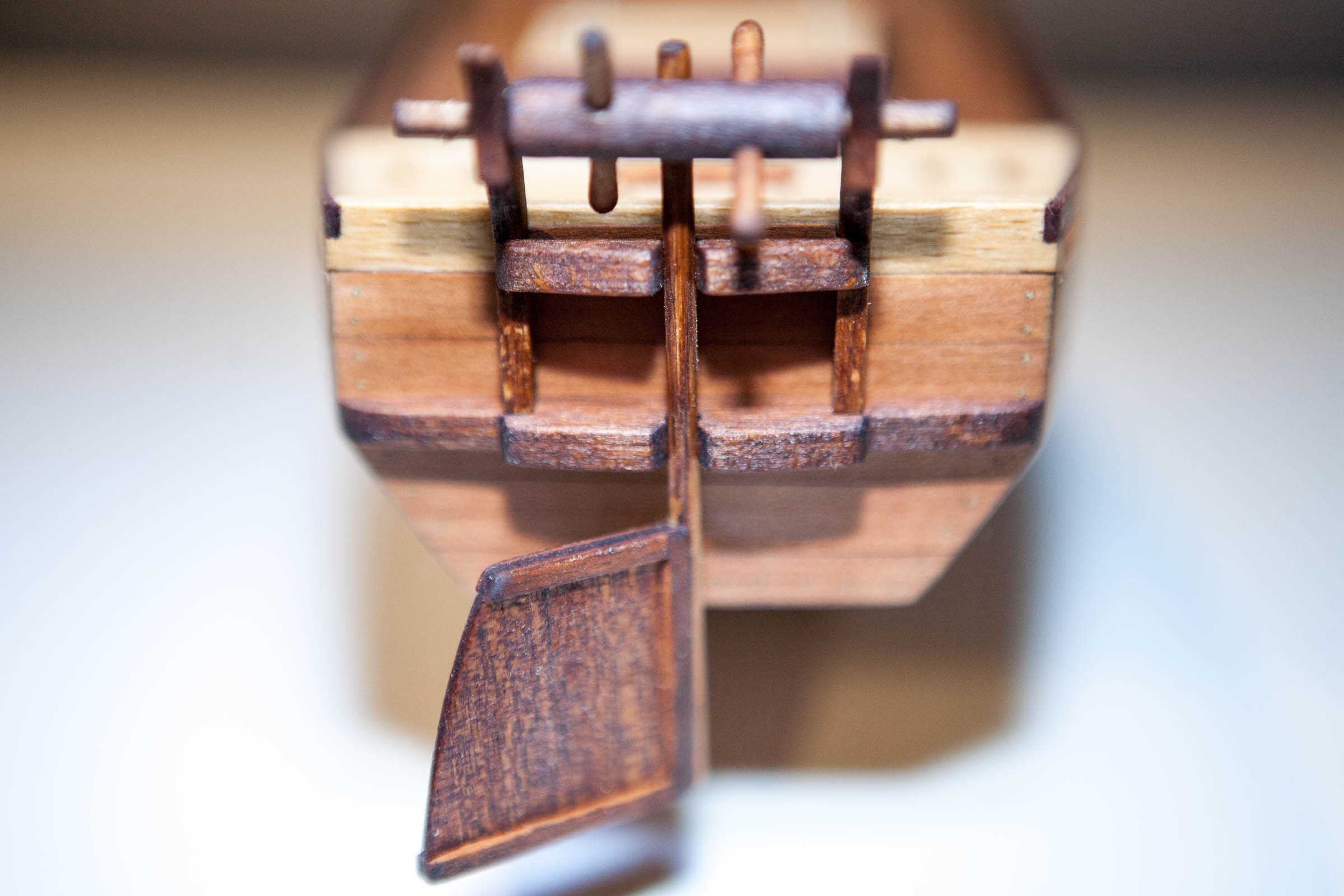 Popracowałem nad nadbudówką/ładownią. Zbudowana z balsy i pokryta fornirem gruszkowym. Pokrywy i podpory ze sklejonych 1/2/3 warstw obłogu bukowego. Elementy stabilizujące z listewek jakiegoś egzotyka.