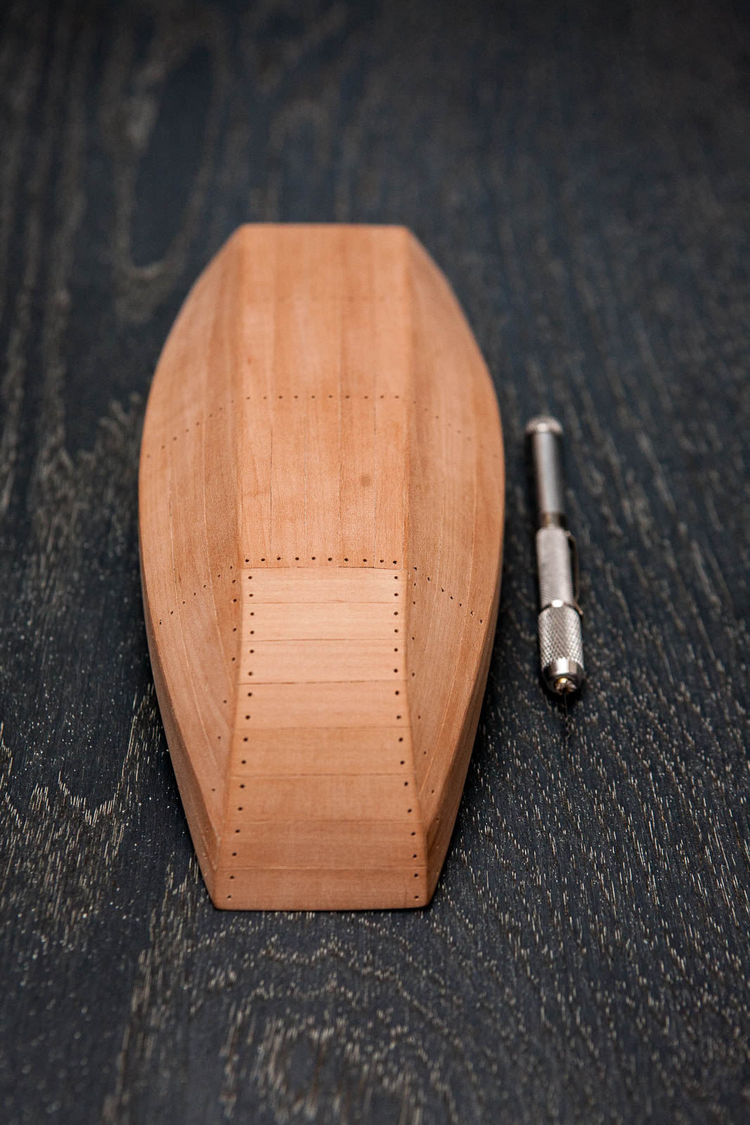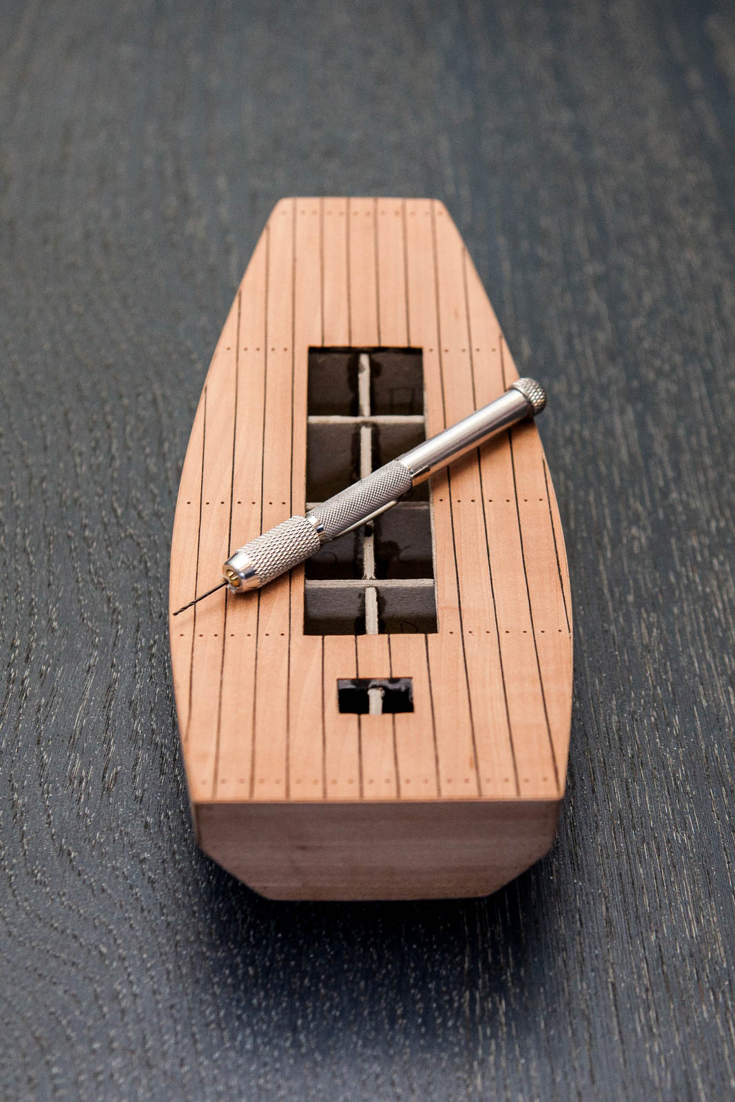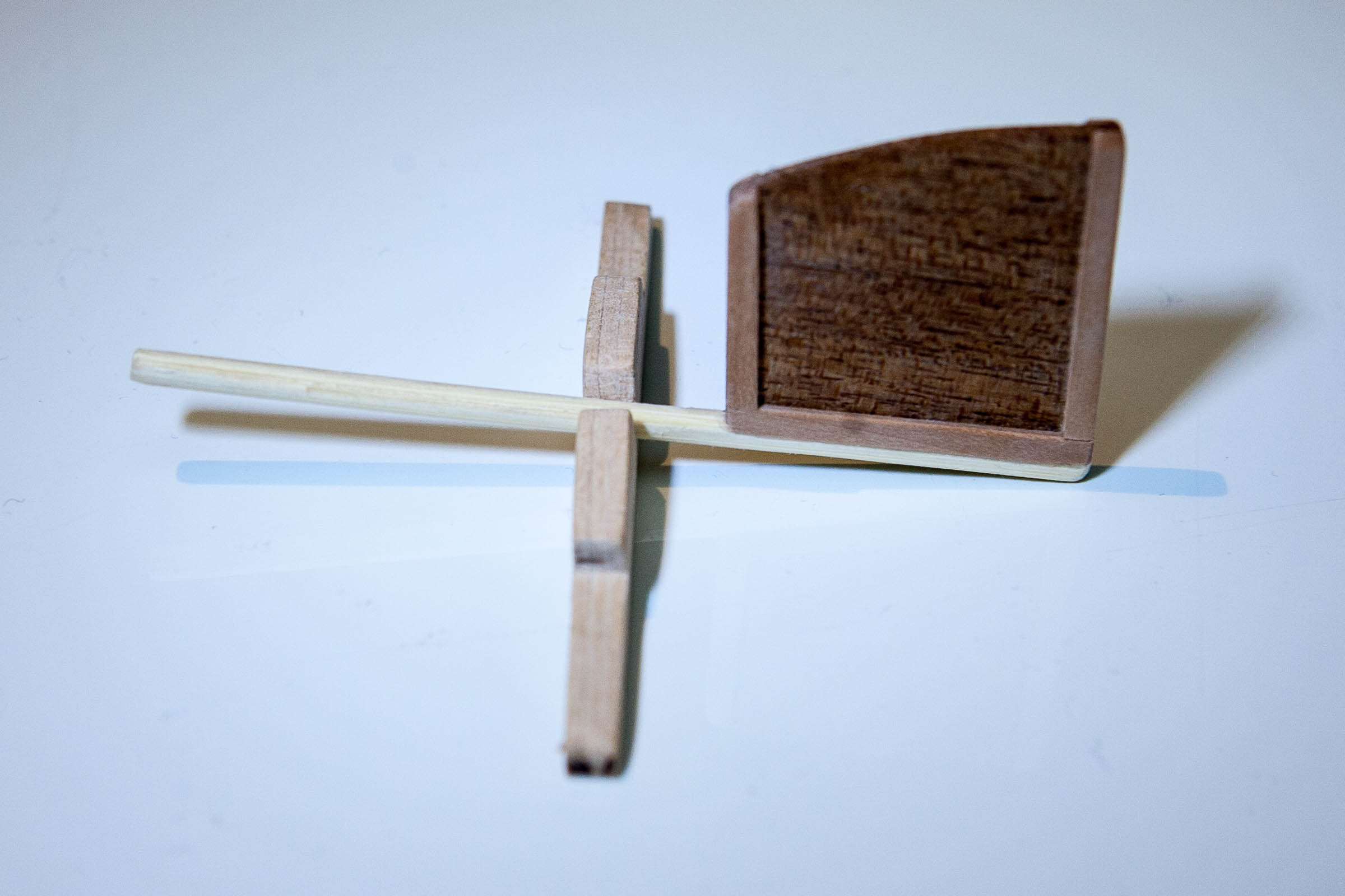 Popracowałem nad nadbudówką/ładownią. Zbudowana z balsy i pokryta fornirem gruszkowym. Pokrywy i podpory ze sklejonych 1/2/3 warstw obłogu bukowego. Elementy stabilizujące z listewek jakiegoś egzotyka.