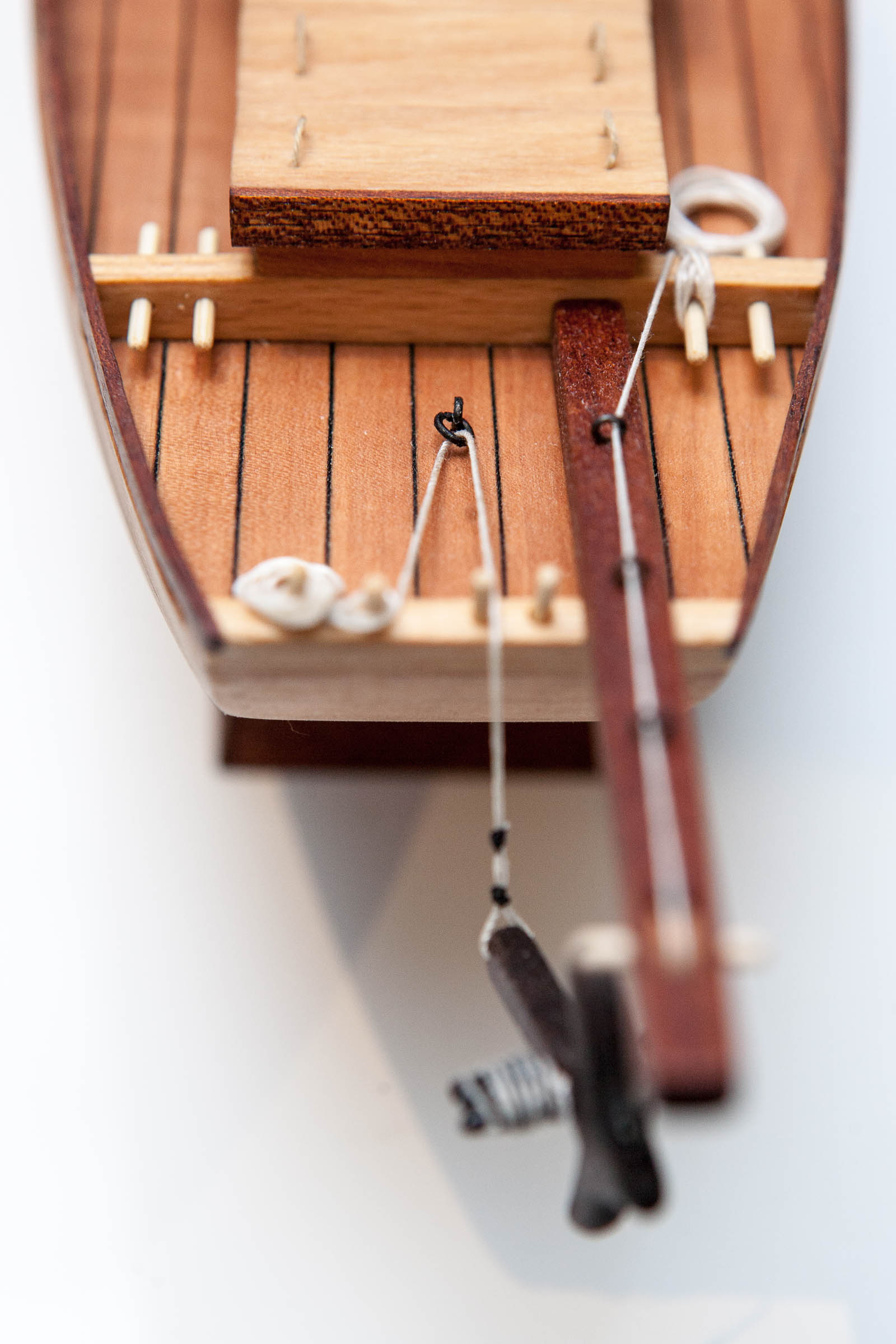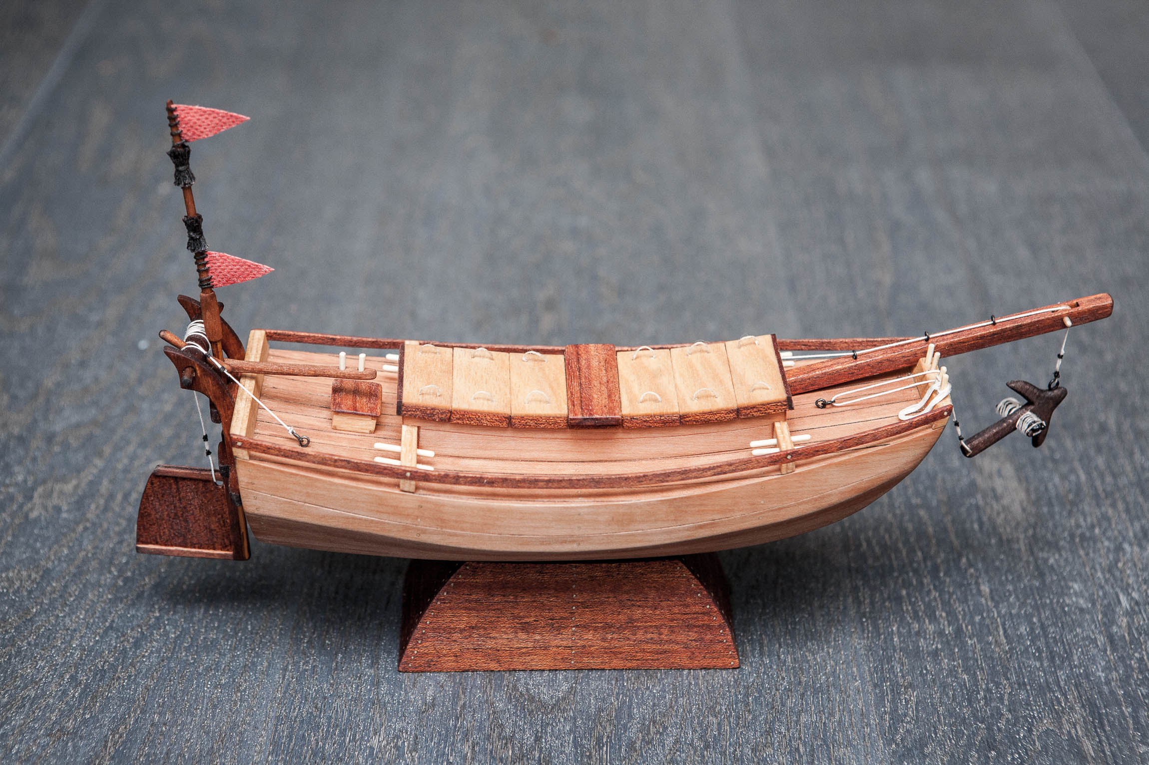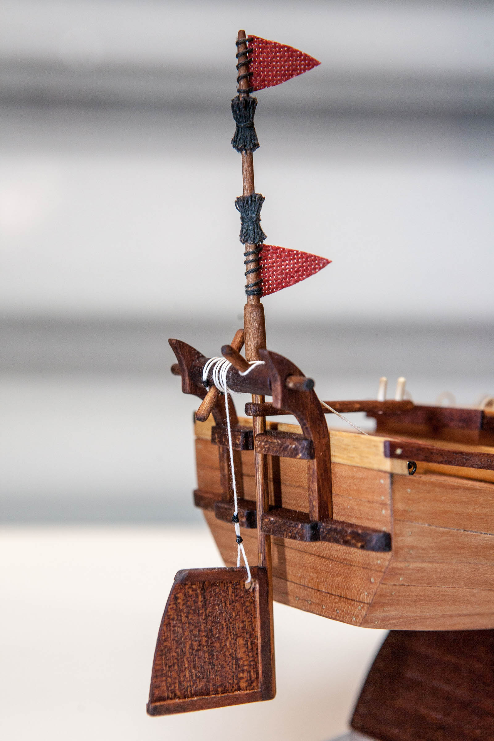 Okucia pozwoliły na montaż kotwicy i elementów na rufie. Prowizoryczna podstawka poszła na złom. Dżonka zasługuje na coś dużo ładniejszego (mam nadzieję, że wyszło godnie).