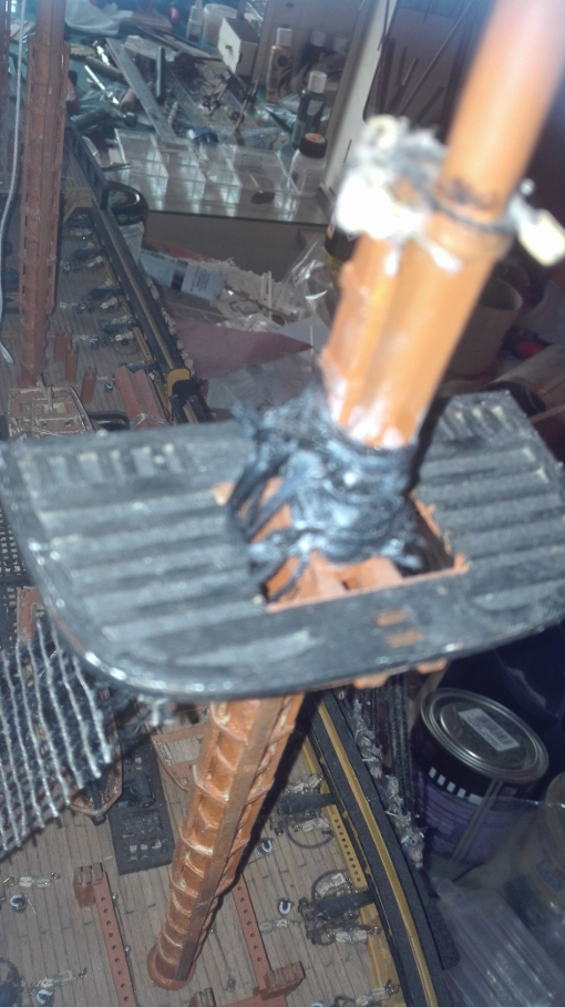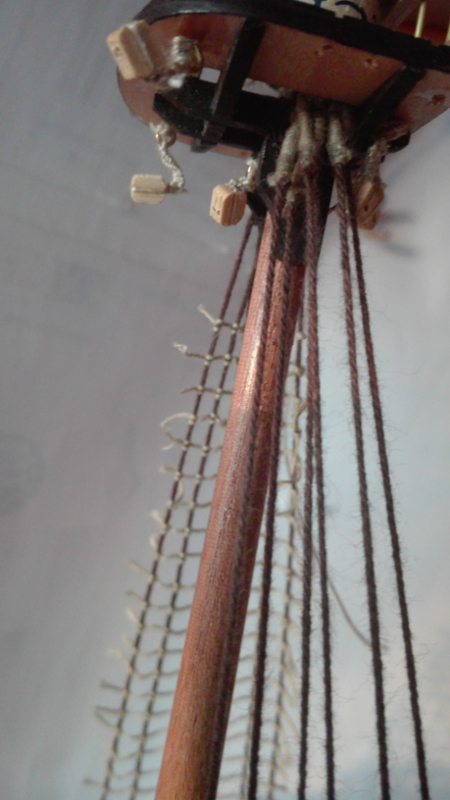 Co do wieszania rei.. ano możesz je przykleić.. ale najpierw powinieneś poprowadzić wszystkie linki – fały służące do podnoszenia i opuszczania rei, wszystkie obejmy itp., aby to wyglądało realistycznie, tak jak było w rzeczywistości, a klej może służyć tylko do utrzymania rei w jakimś określonym położeniu, a nie stanowić jedynego elementu konstrukcyjnego – bo reje nie były przyklejane do masztu!