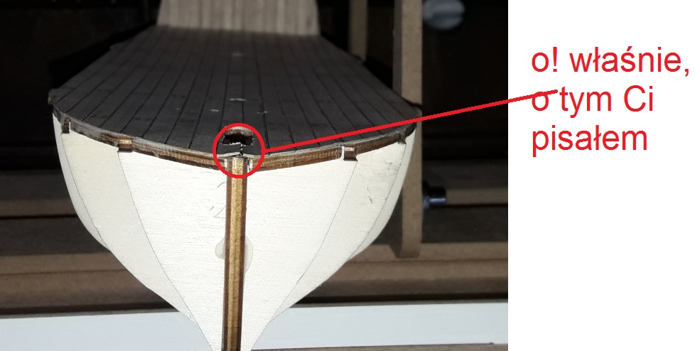Myślisz, żeby oderwać te deski, przeszlifować wręgę na równo? Potem i tak tam będzie szedł bukszpryt, także nie powinno być widać, że nie ma desek...