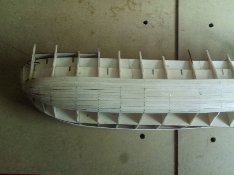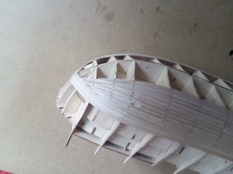 Jak widzę miałeś problem z gięciem elementu ze sklejki (elementy wzdłużne - P5 z zeszytu 16). Szkoda, że nie skorzystałeś z podpowiedzi w grupie VASA, 1628 gdzie radziłem ponacinać piłką (modelarską lub zwykłym brzeszczotem) poprzecznie po wewętrznej stronie co 5 - 8 mm (ja nacinałem co ok. 5 mm i uzyskałem łuk znacznie większy niż potrzeba)