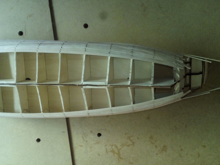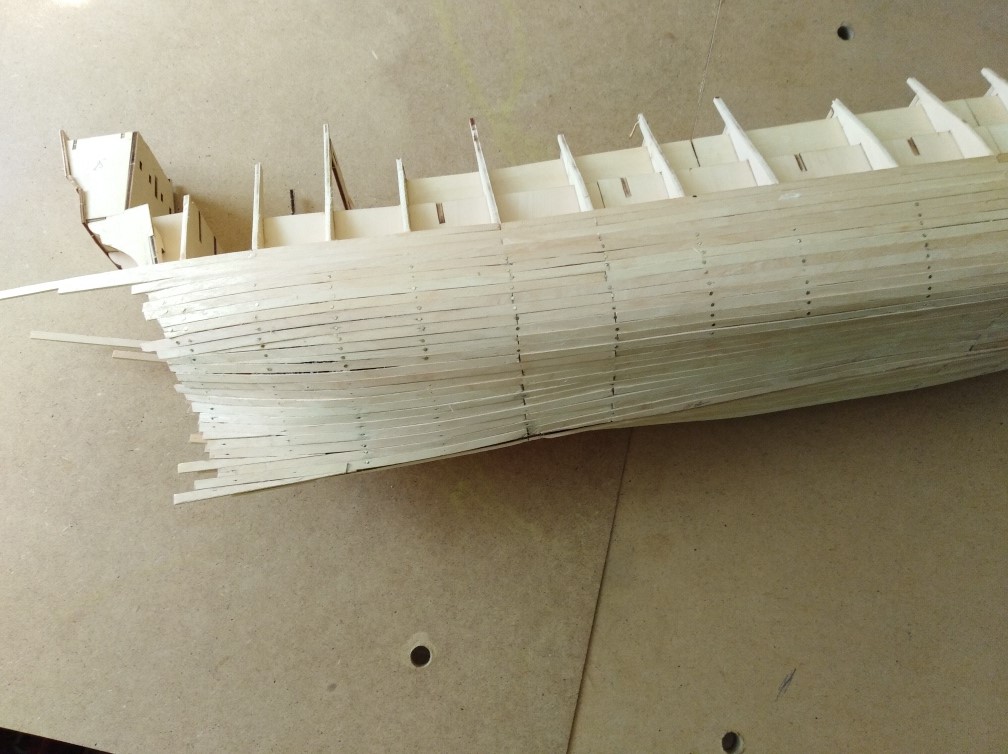 Jak widzę miałeś problem z gięciem elementu ze sklejki (elementy wzdłużne - P5 z zeszytu 16). Szkoda, że nie skorzystałeś z podpowiedzi w grupie VASA, 1628 gdzie radziłem ponacinać piłką (modelarską lub zwykłym brzeszczotem) poprzecznie po wewętrznej stronie co 5 - 8 mm (ja nacinałem co ok. 5 mm i uzyskałem łuk znacznie większy niż potrzeba)