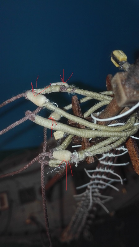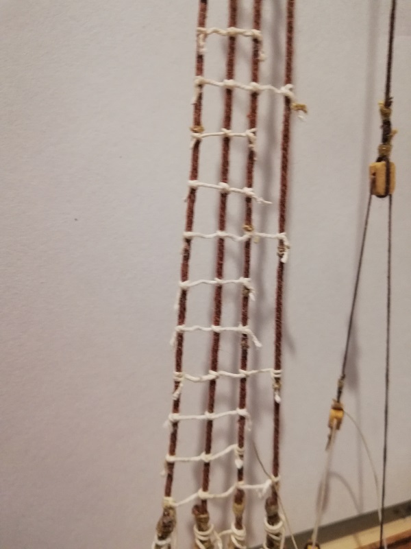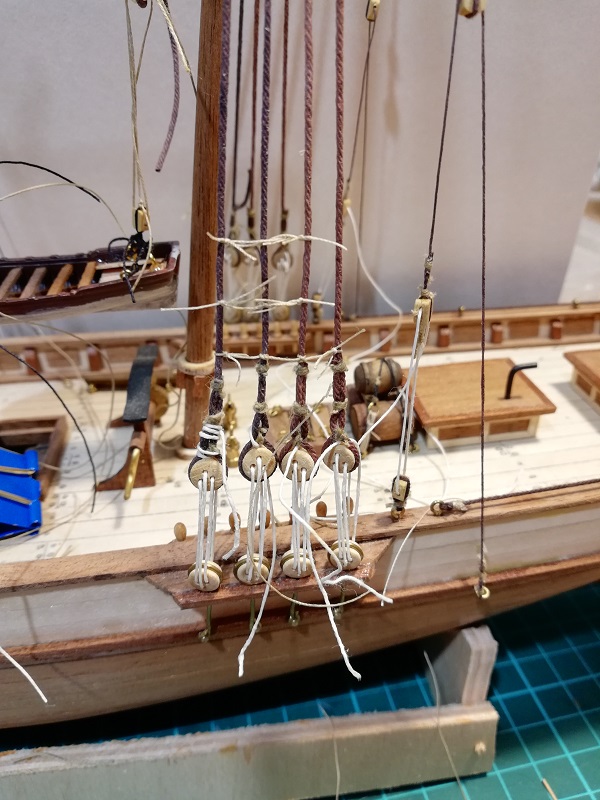 Po zerwaniu zakończeń wyblinek na grotmaszcie okazało się, że większości nie da się "rozwiązać" (są zapaćkane klejem), więc niestety musiałem zerwać (fokmasztu na razie nie ruszałem).