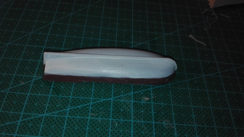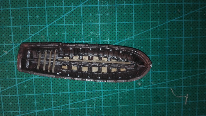 Żeby nie było, że w sprawie szalupy nic się nie dzieję. Nie chciałbym rzucać słów na wiatr ale, brakuje łódce 2 warstwy farby i washa imitującego uszczelnienie. Szalupkę odtłuściłem, prysnąłem podkładem tam, pomalowałem farbami (brąz-tamiya biały-humbrol), po wyschnięciu 2 warstwa, a we wnętrzu szalupy wash z rozcieńczonego czarnego humbrola.