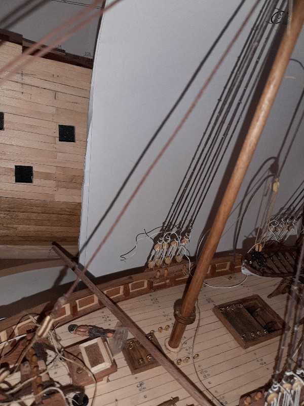 Kończąc żagiel, nie mogłem się powstrzymać by go zawiesić :D , tak samo z reją, tyle że ja jeszcze zdejmę bo zapomniałem dać tam bloczka który jest potrzebny mechanizmowi podnoszenia szalupy.