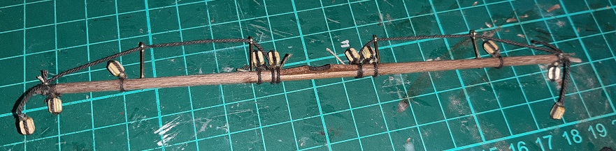 Kończąc żagiel, nie mogłem się powstrzymać by go zawiesić :D , tak samo z reją, tyle że ja jeszcze zdejmę bo zapomniałem dać tam bloczka który jest potrzebny mechanizmowi podnoszenia szalupy.