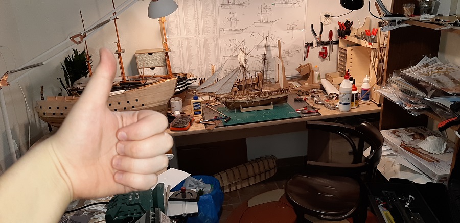Zawiesiłem próbnie fokmasztowy główny żagiel z rejami dwoma i wykonałem PRÓBNE naciągi tych, że rei i żagla. Na razie efekt tylnej części ciała nie urywa, szczególnie włoski ale jak mówiłem jest to wszystko PRÓBNE, i część na pewno zostanie poprawiona. Tak samo zresztą brasy, zamontowałem je, ponieważ chciałem zobaczyć jak jednostka się z nimi prezentuje i..... nie pożałowałem, wygląda z nimi zacnie, ale niestety na zamontowanie ich na stałe będzie mi dane jeszcze ciutkę poczekać.