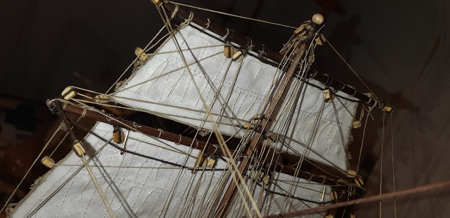 Wykonałem wszyściuteńkie odciągi fokmasztowego wyższego głównego żagla. Zabrałem się też za klejenie likliny do foka.