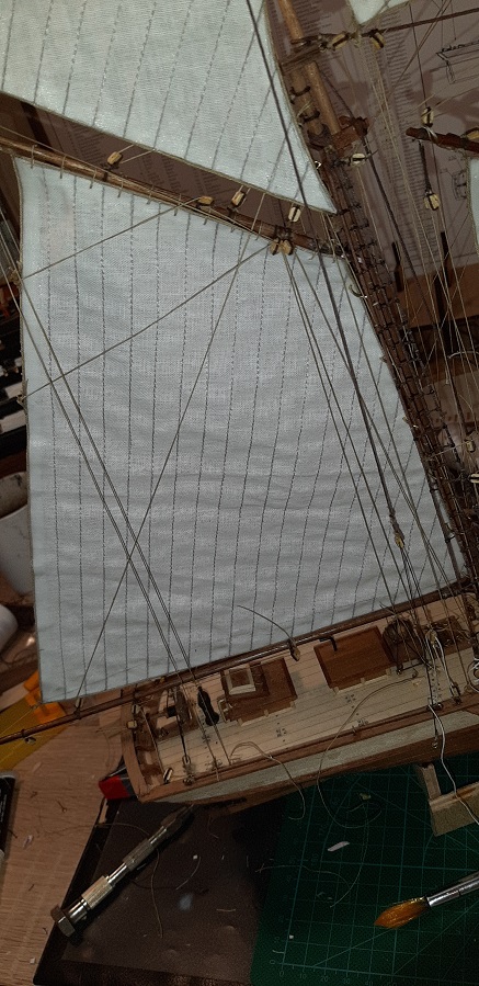 Wykonałem wszystkie odciągi gafla, a zarazem też wszystkie żagle. Teraz tylko buchty :twisted: i bandera.