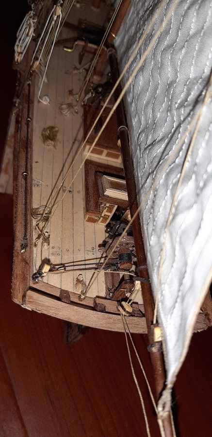 A co do samego modelu, jestem niezwykle szczęśliwy, że go ukończyłem. Przygoda trwająca ponad rok zakończyła się. O wy model jak do tej pory jest świadectwem moim skromnych umiejętności zdobywanych od perły czyli jakieś 8lat. Najbardziej niezadowolony jestem z pokładu i poszycia.... Najbardziej zadowolony jestem z olinowania. Wykorzystałem tu mnóstwo nowych dla mnie rozwiązań, nurkowałem grzebałem, przy okazji dostałem trochę literatury. Gdybym tego nie miał model nie odstawał by "jakością" od "sławnego" tu korsarza. Zdobyte doświadczenie na pewno zaprocentuje w przyszłości, mam nadzieję niedalekiej. Dzięki za rady, "konstruktywną" ;) krytykę. Na pewno to pomogło. Szczególne podziękowania dla Kol. Karrexa który to na forum "gazetkowym" od początku mojej relacji z szkunera pomagał mi i starał się rozwiązać jak że banalne (teraz dla mnie jest to banalne), problemy. Podobnie do @oksal I @ dali.