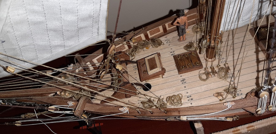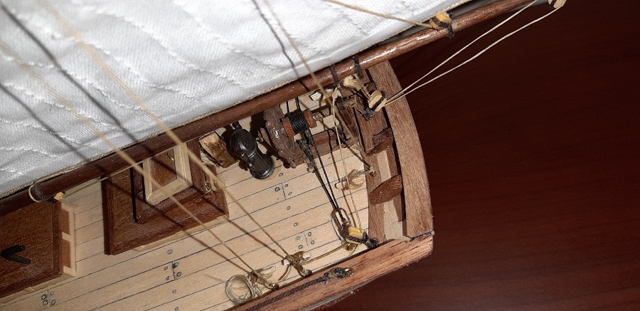 A co do samego modelu, jestem niezwykle szczęśliwy, że go ukończyłem. Przygoda trwająca ponad rok zakończyła się. O wy model jak do tej pory jest świadectwem moim skromnych umiejętności zdobywanych od perły czyli jakieś 8lat. Najbardziej niezadowolony jestem z pokładu i poszycia.... Najbardziej zadowolony jestem z olinowania. Wykorzystałem tu mnóstwo nowych dla mnie rozwiązań, nurkowałem grzebałem, przy okazji dostałem trochę literatury. Gdybym tego nie miał model nie odstawał by "jakością" od "sławnego" tu korsarza. Zdobyte doświadczenie na pewno zaprocentuje w przyszłości, mam nadzieję niedalekiej. Dzięki za rady, "konstruktywną" ;) krytykę. Na pewno to pomogło. Szczególne podziękowania dla Kol. Karrexa który to na forum "gazetkowym" od początku mojej relacji z szkunera pomagał mi i starał się rozwiązać jak że banalne (teraz dla mnie jest to banalne), problemy. Podobnie do @oksal I @ dali.