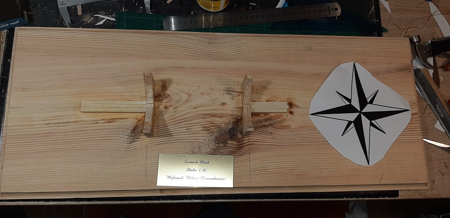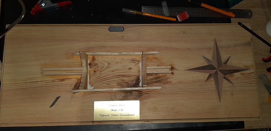 Pierwszy to jest wykonanie róży wiatrów metodą intarsji z forniru, przyklejona na podstawce (coś jak