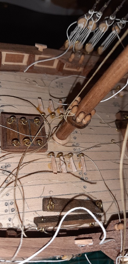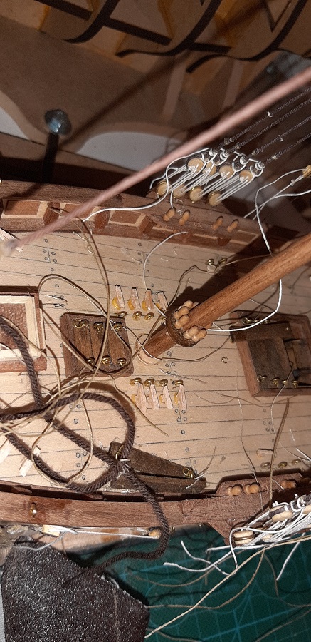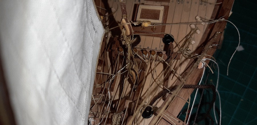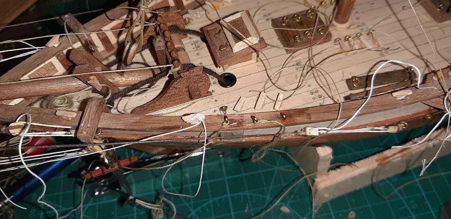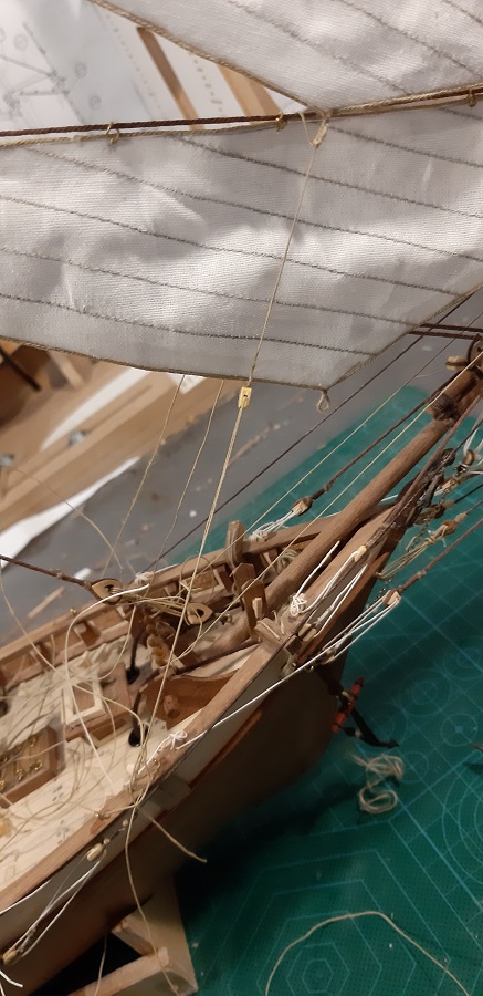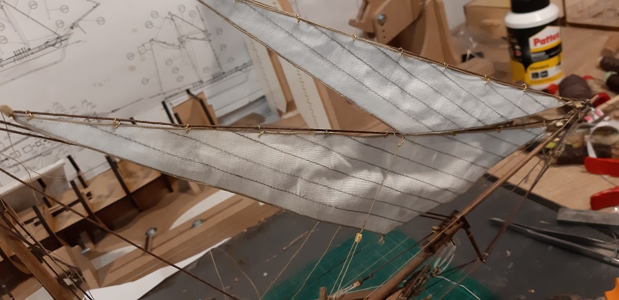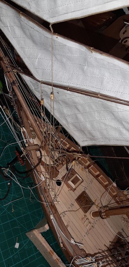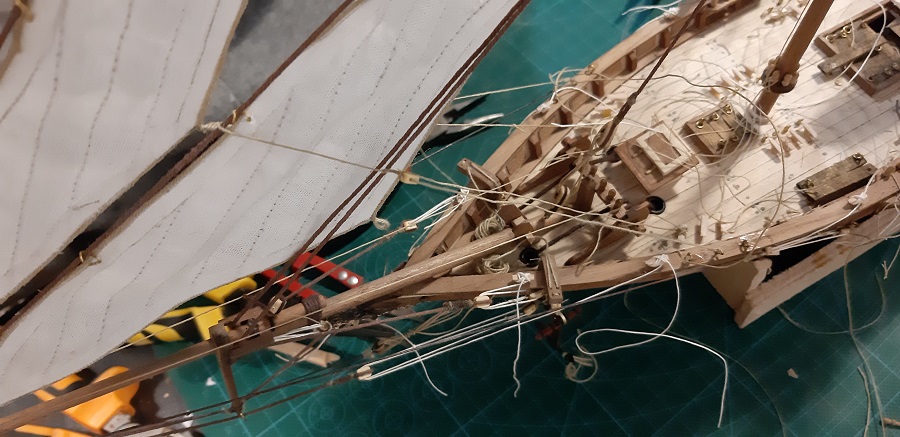 Wykonałem odciągi jegera i zawiesiłem bohkliwer z odciągmi. Prace budowalne na dziobie z żaglami skośnymi uważam za zakończone. To jeszcze 7 żagli
