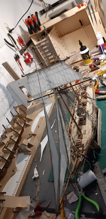 Wykonałem wszyściuteńkie odciągi fokmasztowego wyższego głównego żagla. Zabrałem się też za klejenie likliny do foka.