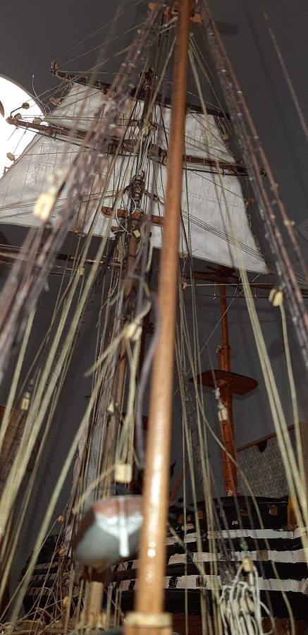 Zawiesiłem próbnie fokmasztowy główny żagiel z rejami dwoma i wykonałem PRÓBNE naciągi tych, że rei i żagla. Na razie efekt tylnej części ciała nie urywa, szczególnie włoski ale jak mówiłem jest to wszystko PRÓBNE, i część na pewno zostanie poprawiona. Tak samo zresztą brasy, zamontowałem je, ponieważ chciałem zobaczyć jak jednostka się z nimi prezentuje i..... nie pożałowałem, wygląda z nimi zacnie, ale niestety na zamontowanie ich na stałe będzie mi dane jeszcze ciutkę poczekać.
