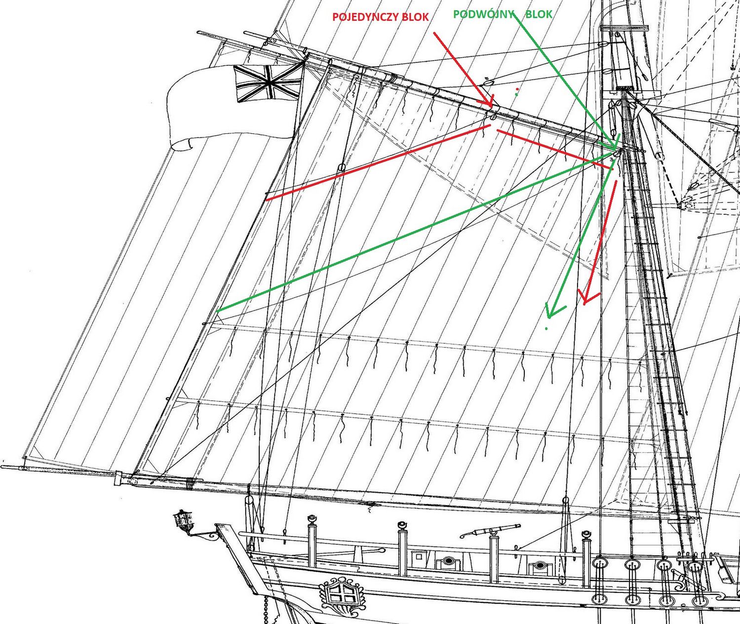Nie widziałem Twoich planów, ale wydaje mi się, że masz źle poprowadzone liny przez bloki na gaflu.