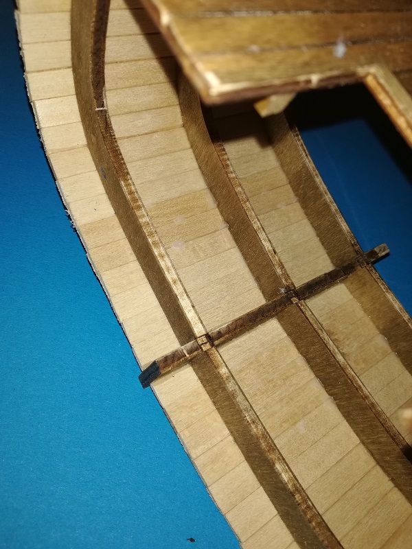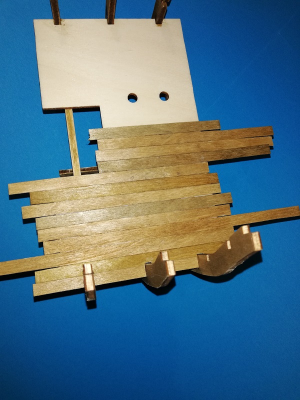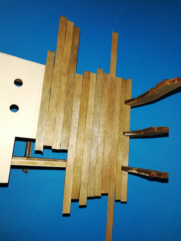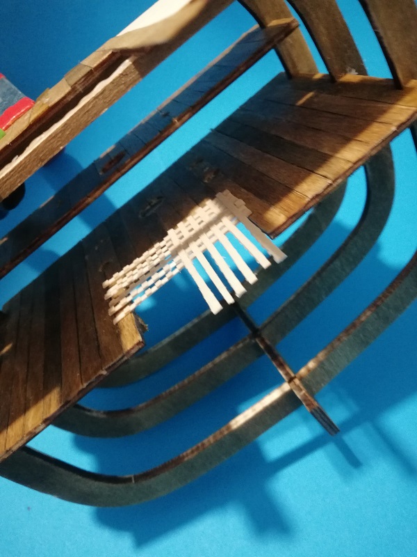 Wkleiłem pokładniki. Pokład jest włożony tylko na sucho dlatego, że chciałem by odległości między wręgami były idealne. Pokładniki bejcowałem i lakierowałem.