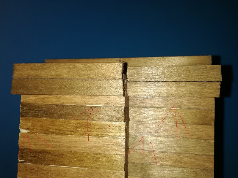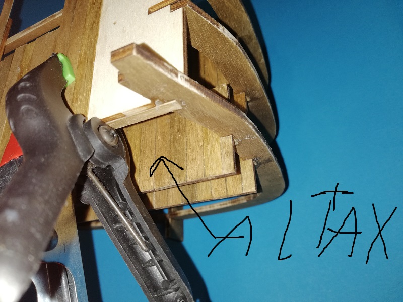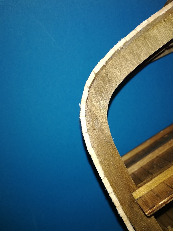 W niektórych miejscach na łączeniach desek pokładu widać szparki, było to spowodowane po części użyciem niewłaściwego ostrze i w większej części nie segregowanie listewek przeze mnie. Mogę się usprawiedliwiać, że cień był, że światło, ale po co? każdy wie jaka jest prawda. Takie partactwo się więcej nie powtórzy.
