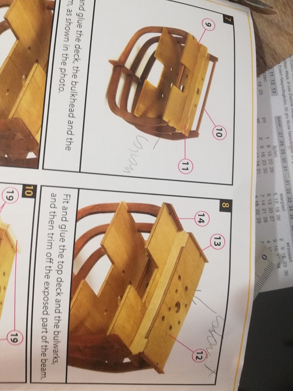 Ukończyłem dolny pokład działowy, bez odstępstw od instrukcji pomijając to, że zabrakło mi kilku planek do skończenia pokładu pokładu i musiałem je dorobić z balsy... Wyszedł też brak bejcowania części wewnętrznej przed przyklejeniem..... Tam gdzie jest czyste drewno przyjdzie farba, przedtem capon, Na wszystkie oznaki partactwa, typu szparki pomiędzy plankami przyjdą różnego rodzaju pakunki, wiem, że powinny być zamocowane na stałe, ale uznałem, że to szopka i obniży to walory estetyczne modelu, jak wcześniej mówiłem pozwalam na to sobie ponieważ nie znam dokładnych danych modelu. Gretingów też nie wykonuje ponieważ uznałem, że będą one rozpraszały uwagę widza, która ma bycć skierowana na "Boże narodzenie".