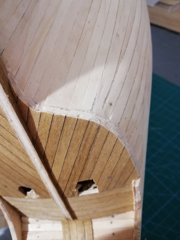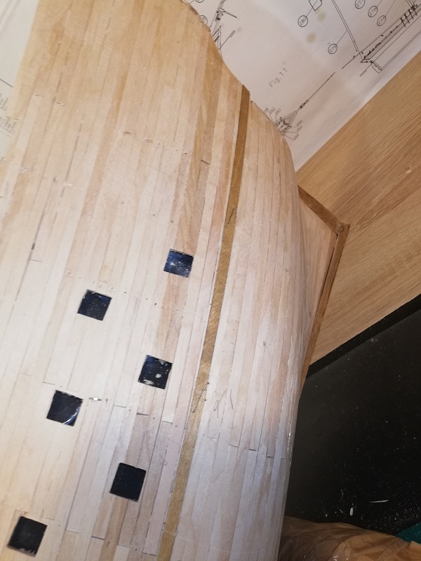 Ukończyłem 2 rząd planek na obu burtach, przymierzyłem stealera na dziobie.