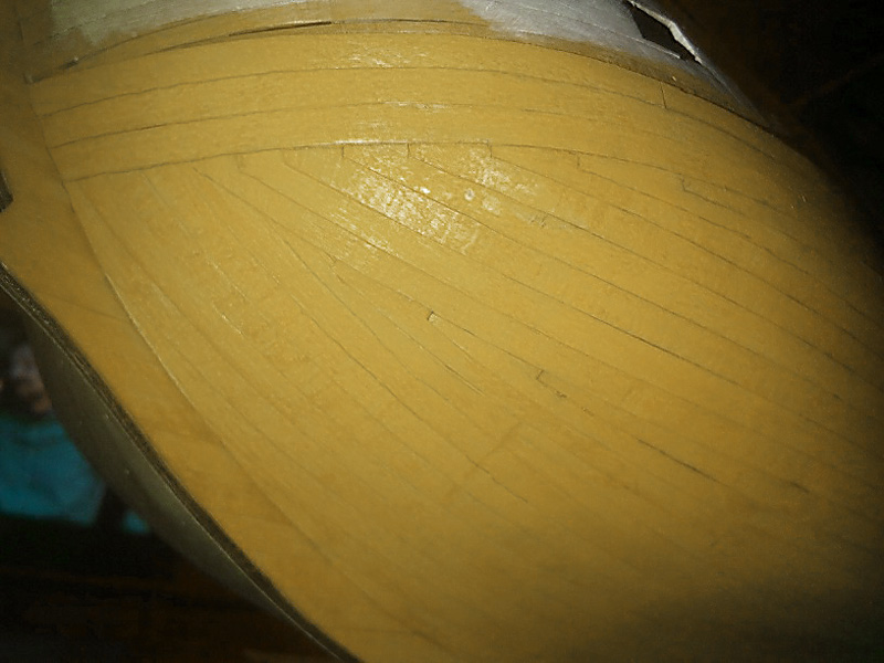 Po mojemu, to nie zweziles wystarczajaco (albo wcale) gornych rzedow planek na dziobie - tych idacych powyzej odbojnika i w rezultacie odbojniki na dziobie leza u Ciebie zbyt plasko (nisko), a powinny sie tam nieznacznie wznosic lagodnym lukiem ku gorze - wtenczas bedziesz mial nieco (wystarczajaco?) wiecej przestrzeni na nizsze planki, ktore wowczas nie beda sie az tak ostro wznosic ku gorze, zmuszajac Cie do ich ostrego zakonczenia i zamontowania pod wyzszymi plankami czy odbojnikami. Dokladnie sprawdz na swych planach polozenie odbojnikow na calym kadlubie i zweryfikuj ze swoim modelem. Dopiero potem zabierz sie za poszywanie reszty.