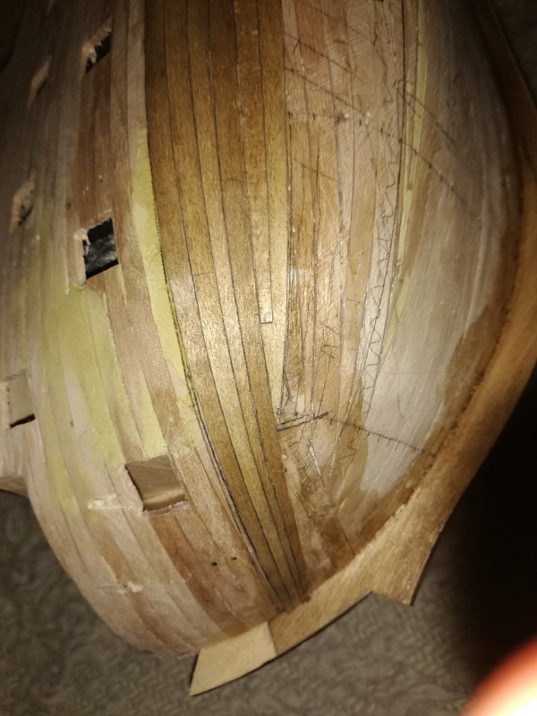 Dziecko. Batensy układane płasko na kadłubie, w częsci dziobowej zawsze będą schodziły się w jeden punkt. Dlatego ich przebieg na dziobie należy nieco skorygować doginając je lekko w dół. viewtopic.php?f=524&t=45135&start=50. Proponuję spróbować, będzie ci znacznie łatwiej układać poszycie, kiedy podzielisz sobie denną część kadłuba na węższe pasy wyznaczone za pomocą batensów.