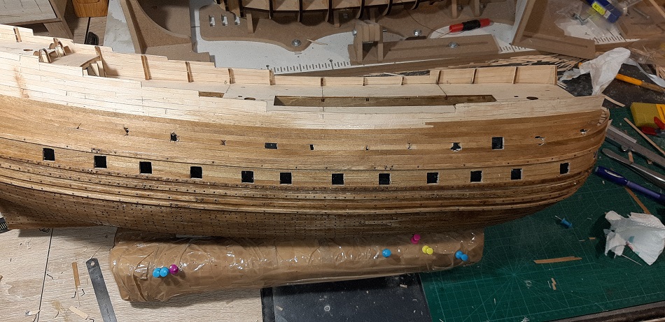 Niestety odbojnic na tym etapie już się nie da zgrać-trzeba było to zrobić przed jakimkolwiek poszywaniem kadłuba-trudno-nauczka na przyszłość.