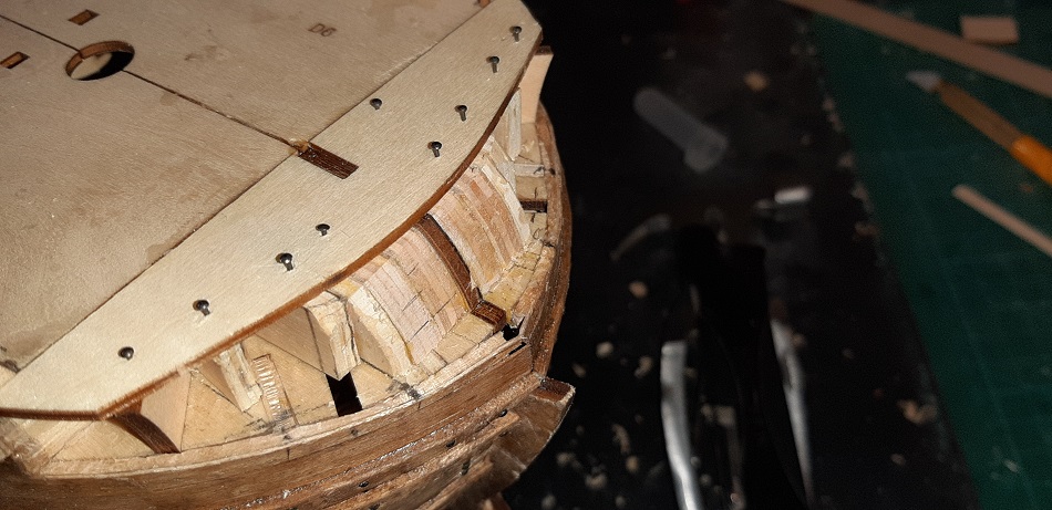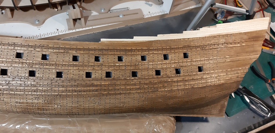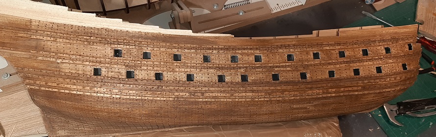 Jestem zadowolony z efektu. To teraz tylko wiercenie otworów pod kołeczki, wsporniki nadburcia zrobić, lakierowanie, wykończenie kadłuba, detale pokładu, figurki, olinowanie i będzie koniec ;)