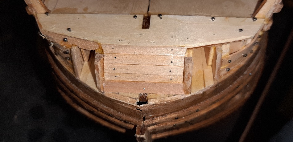 Poszywanie pokładu. Tak jak pisałem dychtunek robiony cienką nitką. Owy sposób wymaga więcej pracy niźli popularna wśród początkujących metoda rysowania krawędzi desek ołówkiem, ale wg mnie efekt to wynagradza. Uszczelnienie jest bardzo wyraźne, i nic z nim nie ma prawa się stać. Prace na dziobie też posuwają się do przodu. Wszelkie nieopalone włoski znikną po cyklinowaniu.