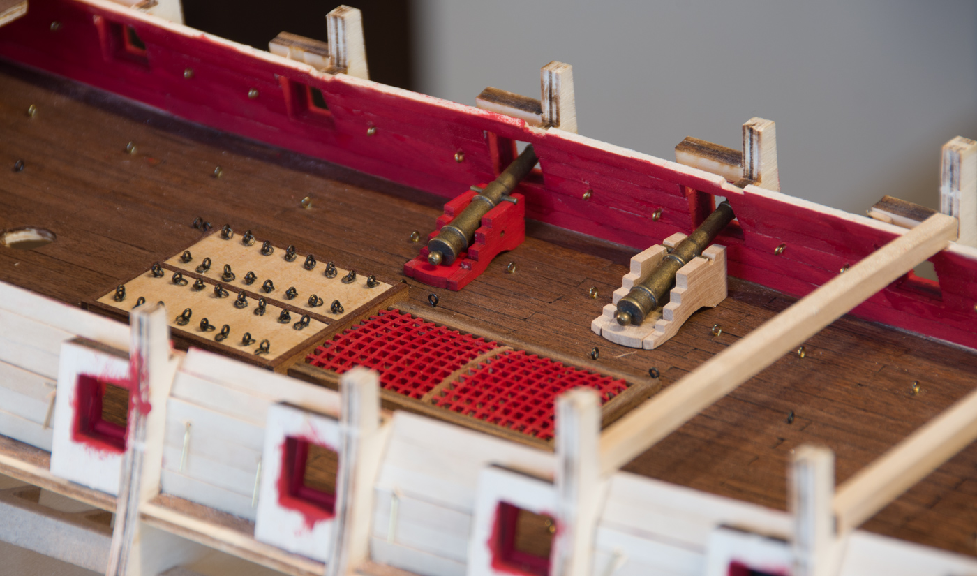 Zanim zacznę zakrywać pokłady muszę zdecydować się na ostateczną wersję wyposażenia. Pokusiłem się na samorobione lawety celem sprawdzenia wersji kolorystycznej. Oczywiście do ich wykończenia jeszcze trochę, niemniej trzeba się zdecydować, którą drogą iść. W instrukcji sporo wyposażenia, w tym lawety, są w czerwonym kolorze. Na marginesie sporo będzie czerwonego, praktycznie całe wyposażenie (schody, dzwonnica, burty, koło sterowe, gretingi, i wspomniane lawety).