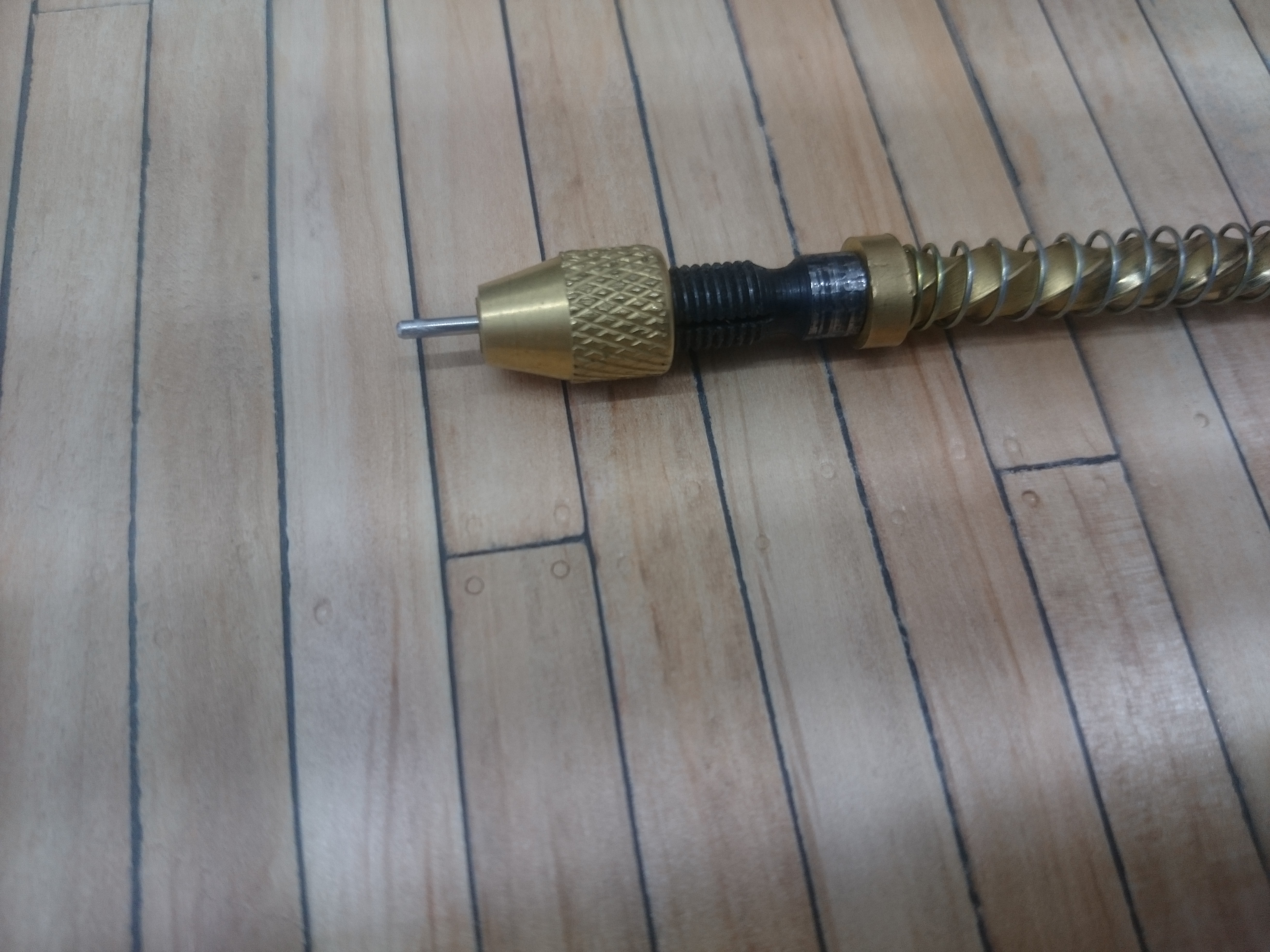 Najlatwiej i chyba najszybciej, a zarazem najbardziej wiernie dla oka mozna zrobic takie treenailsy w ten sposob, ze bierzesz reczna wiertareczke - pin vise drill (patrz zalacznik), zakladasz w jej uchwycie mala rurke albo odpowiedniej wielkosci (do Twej skali modelu) igle medyczna z zaostrzona krawedzia ucietego na plasko konca i wyciskasz w plankach malenkie kółeczka, po czym powlekasz powierzchnie olejem lnianym (lepiej jeszcze olejem dunskim czy tungowym do konserwacji mebli) i otrzymasz w ten sposob perfekcyjne reprezentacje treenaili.