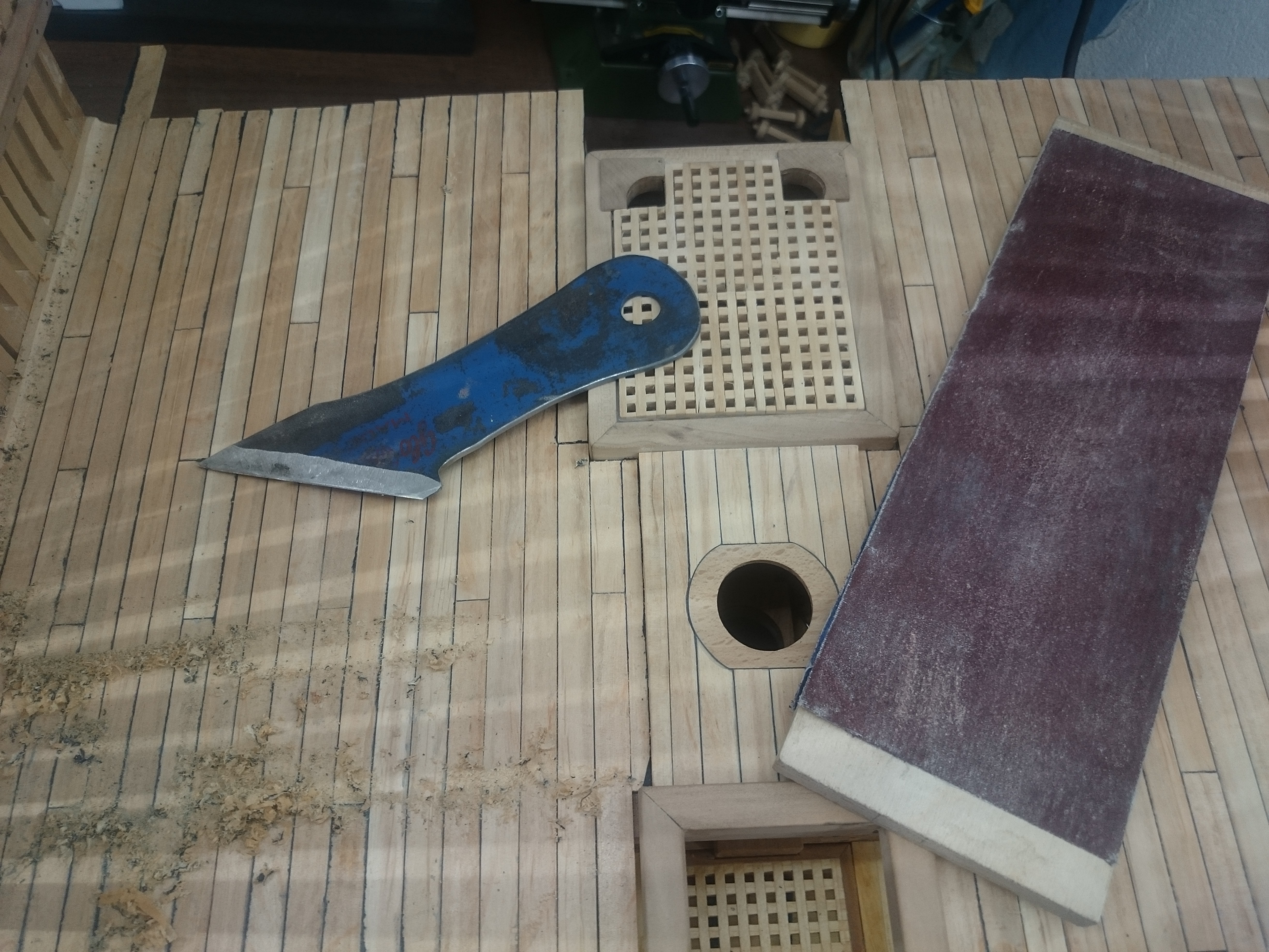 Następnie deski pokładu zostały wycyklinowane nożykiem zrobionym w brzeszczotu piły ramowej.