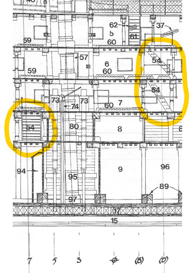 W przedniej części przekroju z środkowego pokładu działowego (Middle Deck) na główny pokład działowy (Lower Deck/Gun Deck) schodzą schody. Zaznaczone na żółto.