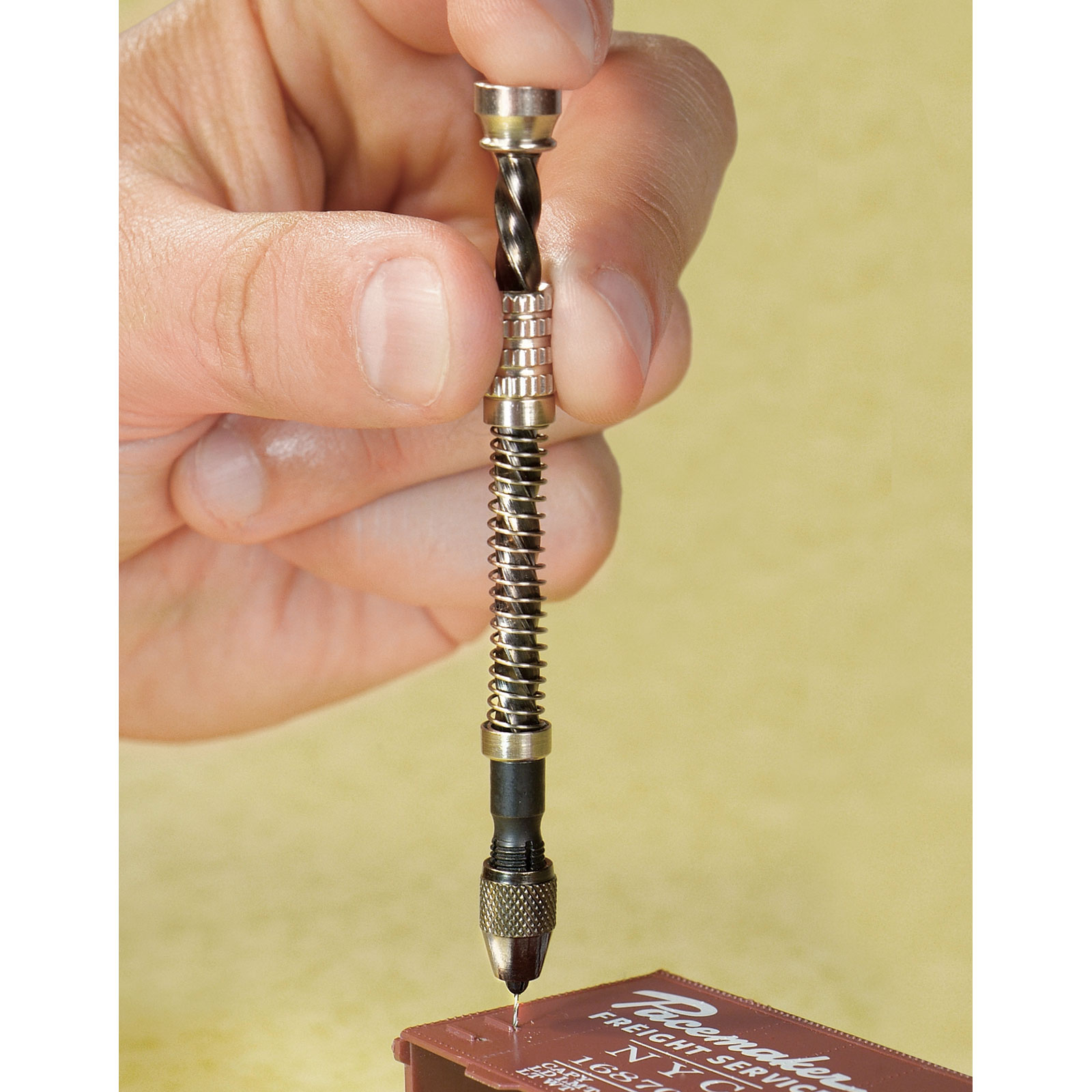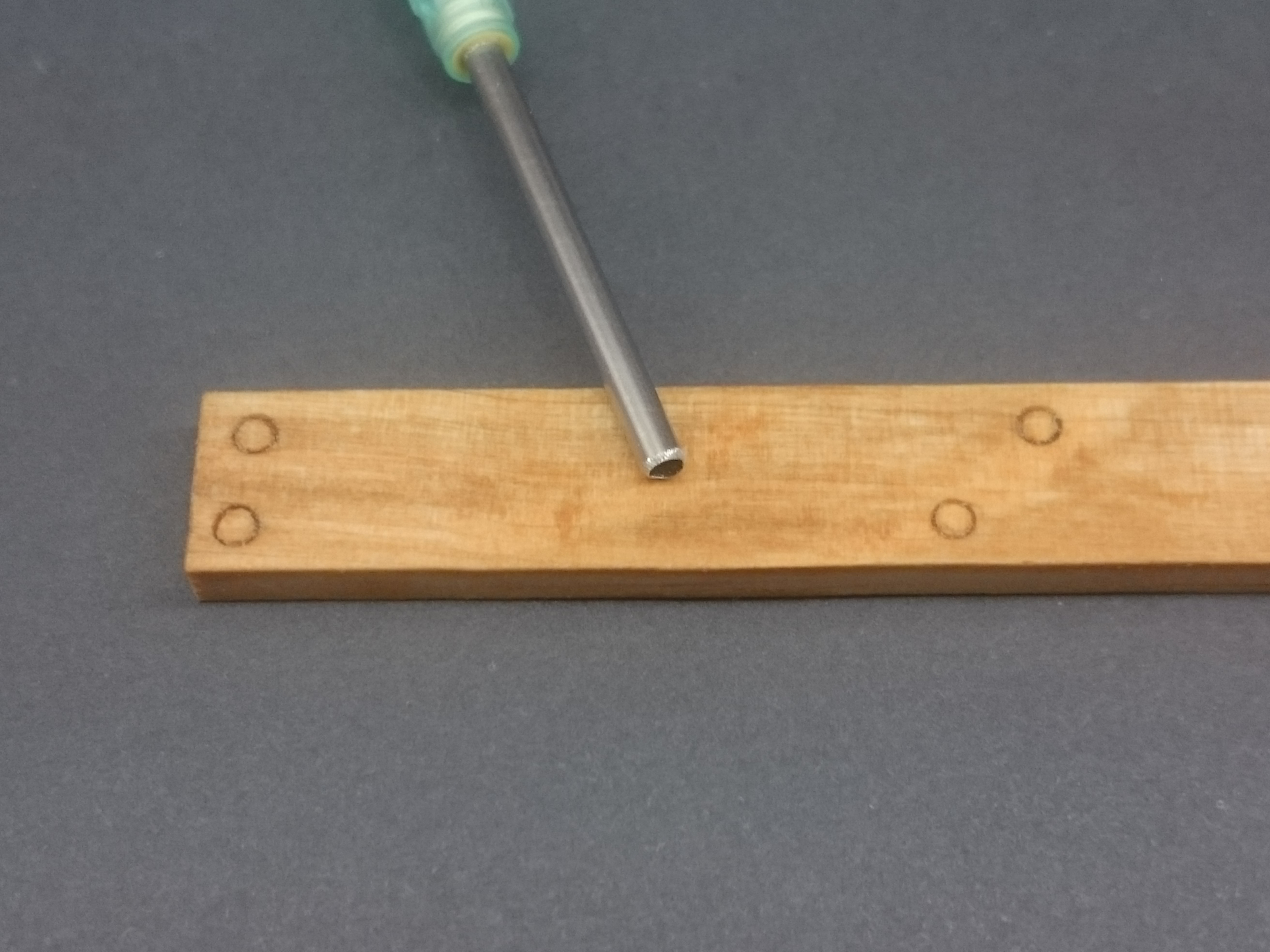 Najlatwiej i chyba najszybciej, a zarazem najbardziej wiernie dla oka mozna zrobic takie treenailsy w ten sposob, ze bierzesz reczna wiertareczke - pin vise drill (patrz zalacznik), zakladasz w jej uchwycie mala rurke albo odpowiedniej wielkosci (do Twej skali modelu) igle medyczna z zaostrzona krawedzia ucietego na plasko konca i wyciskasz w plankach malenkie kółeczka, po czym powlekasz powierzchnie olejem lnianym (lepiej jeszcze olejem dunskim czy tungowym do konserwacji mebli) i otrzymasz w ten sposob perfekcyjne reprezentacje treenaili.