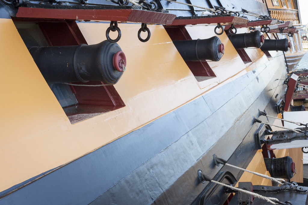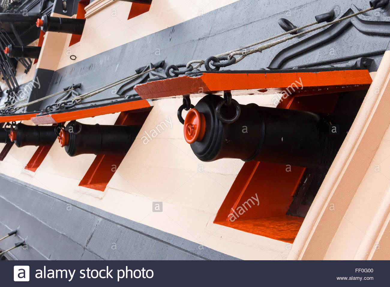 Te ambrażury (luki dzialowe) to byly takie czworakatne (nie kwadratowe!) okna dla dzial. Odcinki pionowe tych lukow - byly takie wlasnie - pionowe... Odcinki poziome (gorne i dolne "parapety") byly poziome tylko w srodokreciu, kat ich zmienial sie stopniowo ku dziobowi i rufie, bo byly one ustawione wg. biegu pokladu, ktory byl poziomy tylko w srodokreciu a ku dziobowi i rufie wznosil sie stopniowo. Stad ich romboidalne ksztalty.