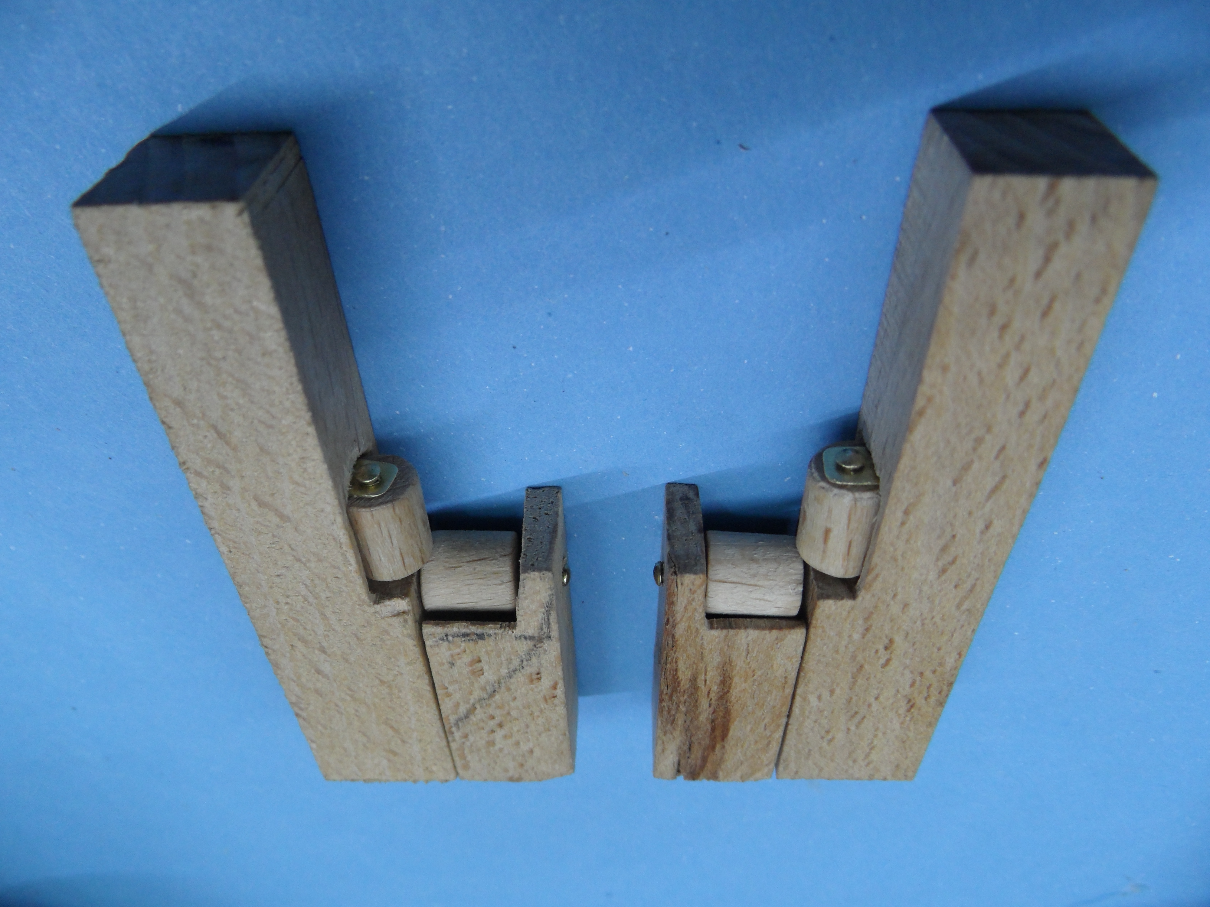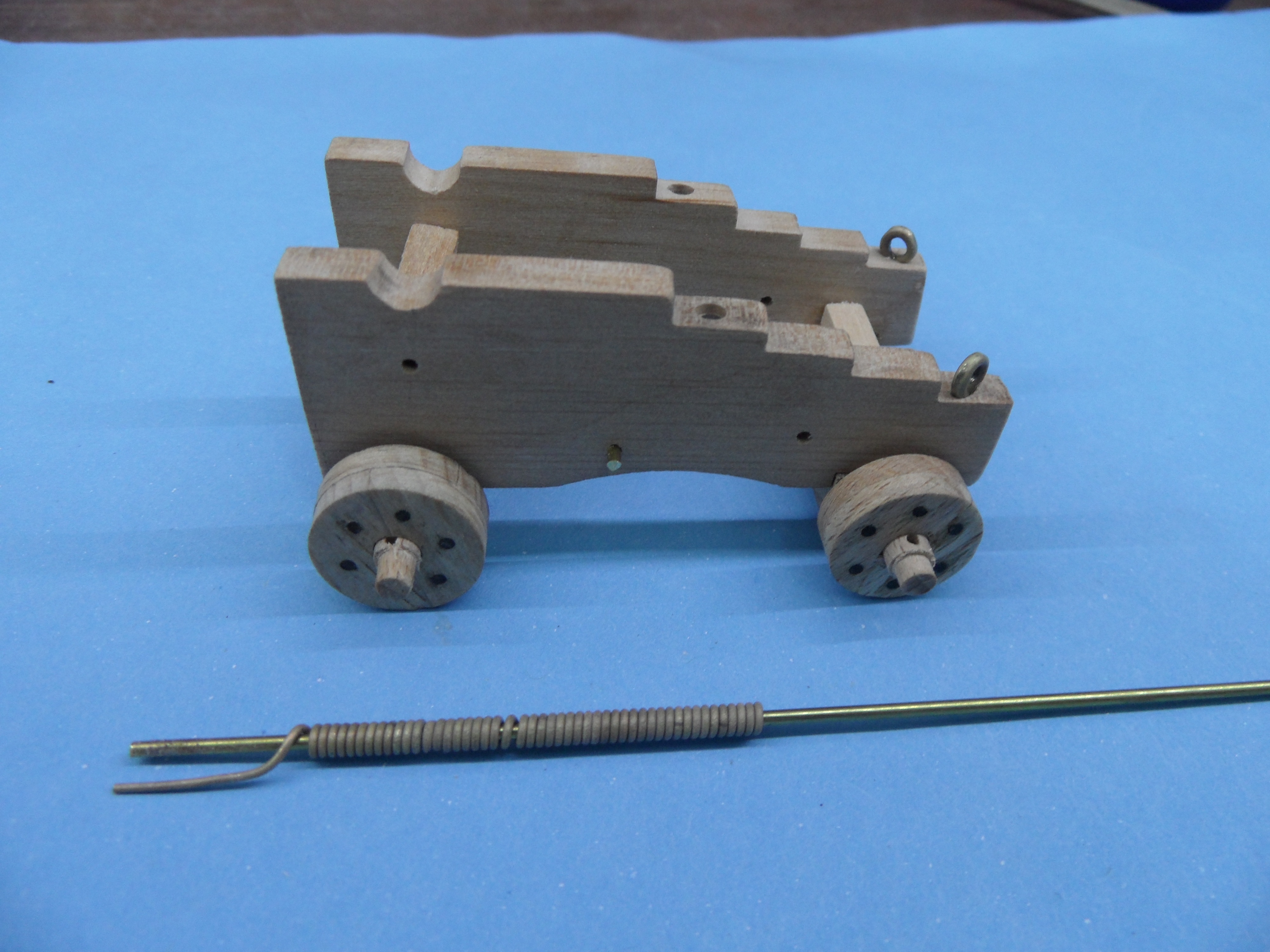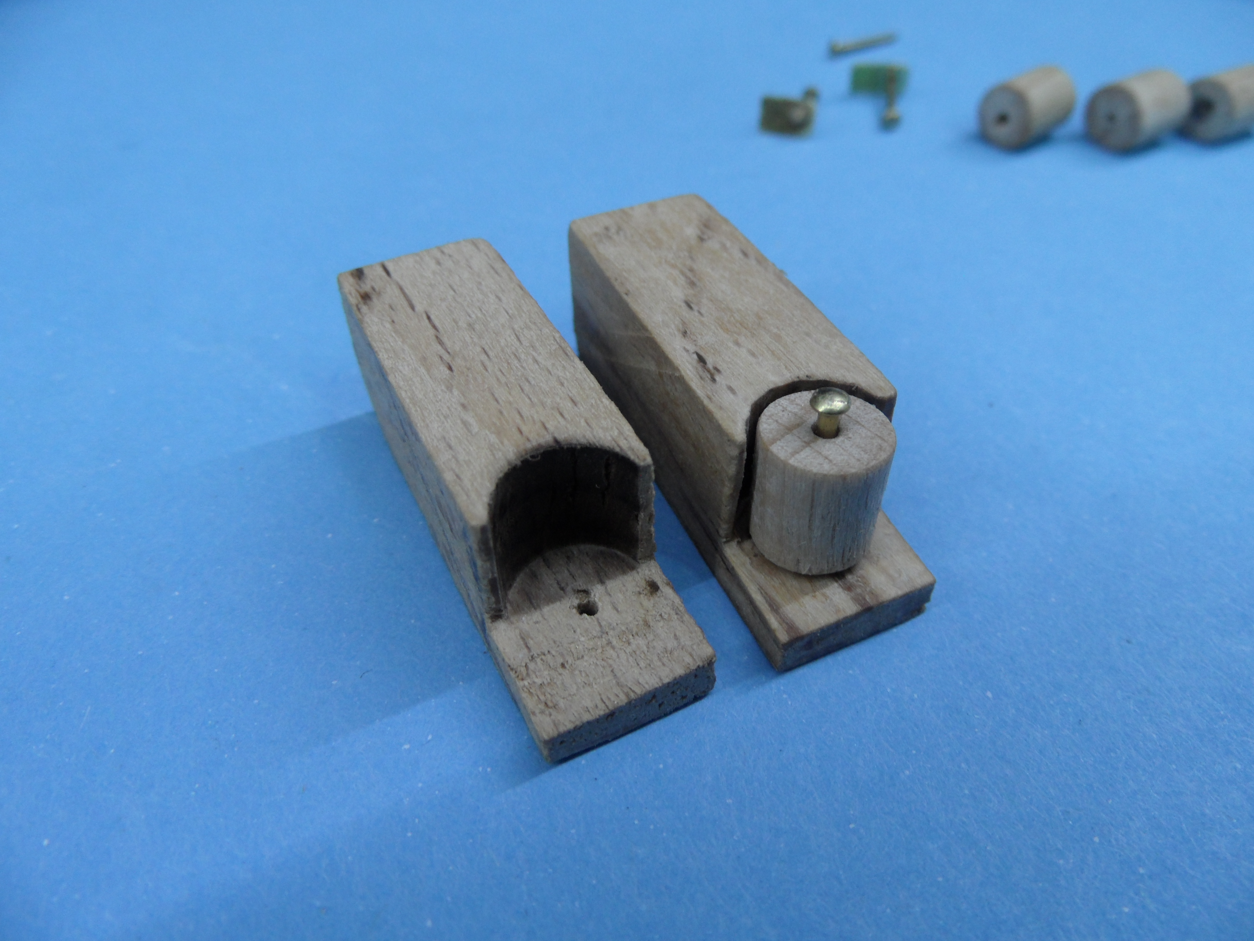 c. osie wałków z gwoździ mosiądzowanych, a uchwyty rolki w belce pionowej z blaszki mosiężnej gr. 0,7 mm.
