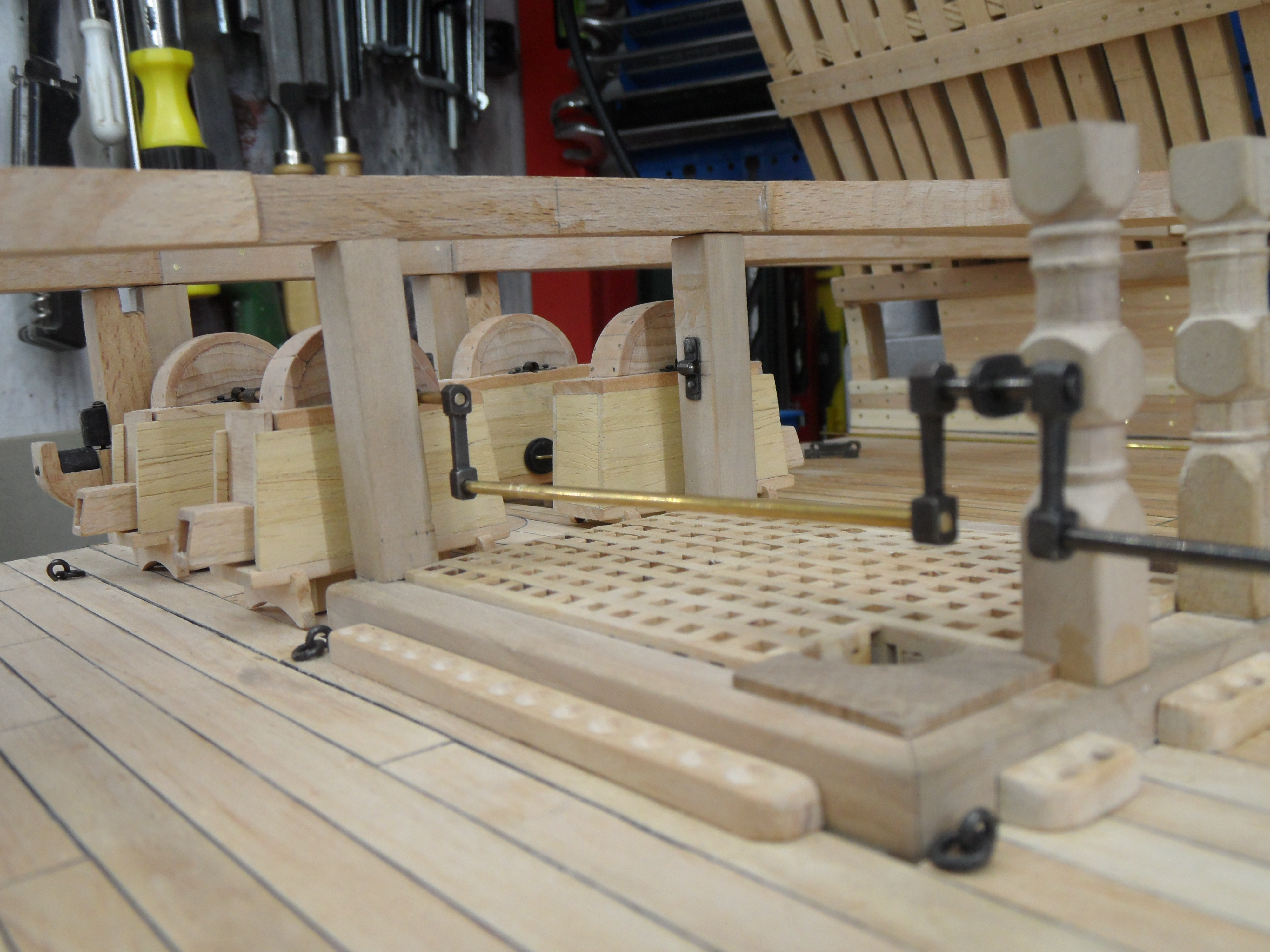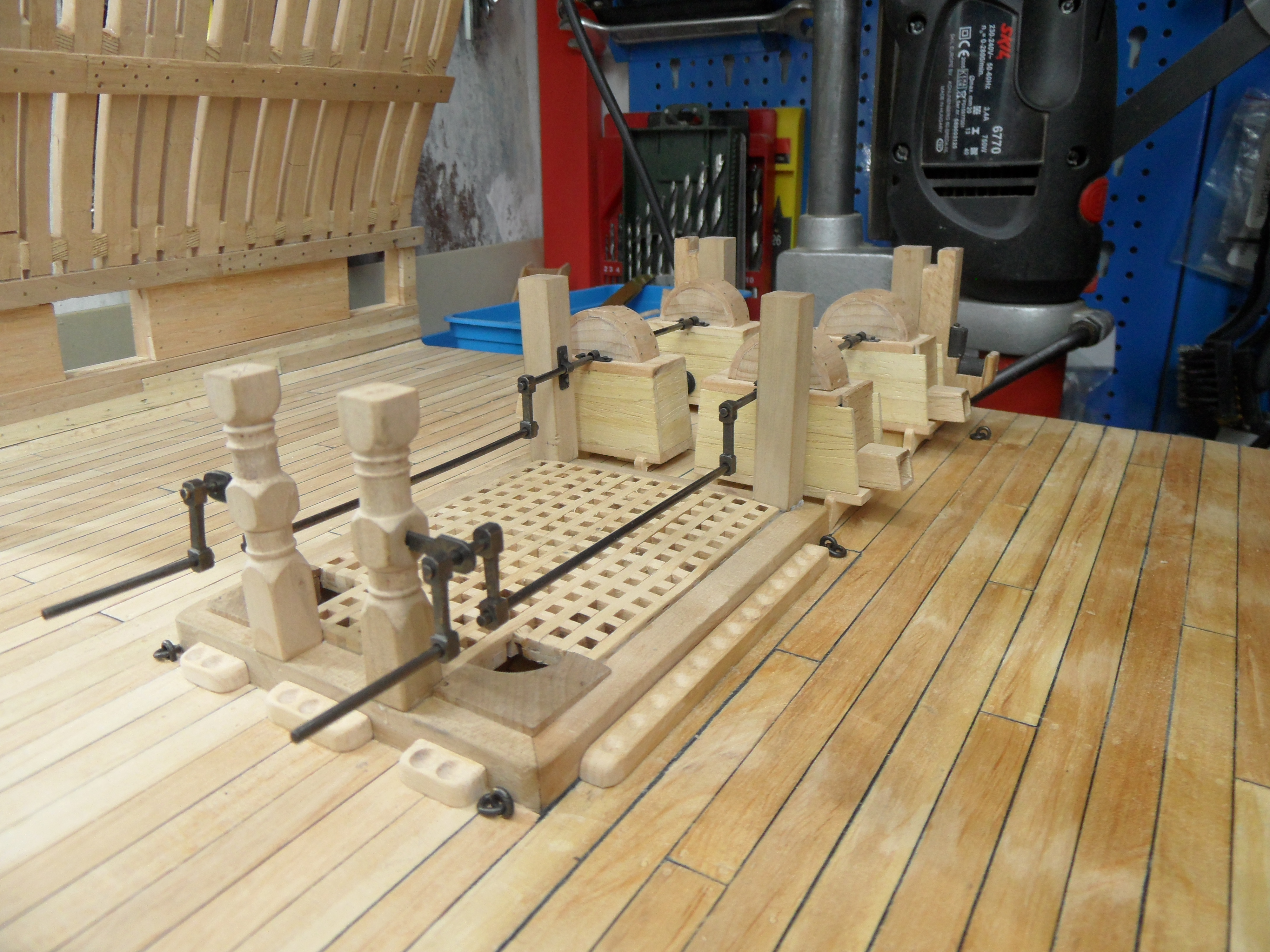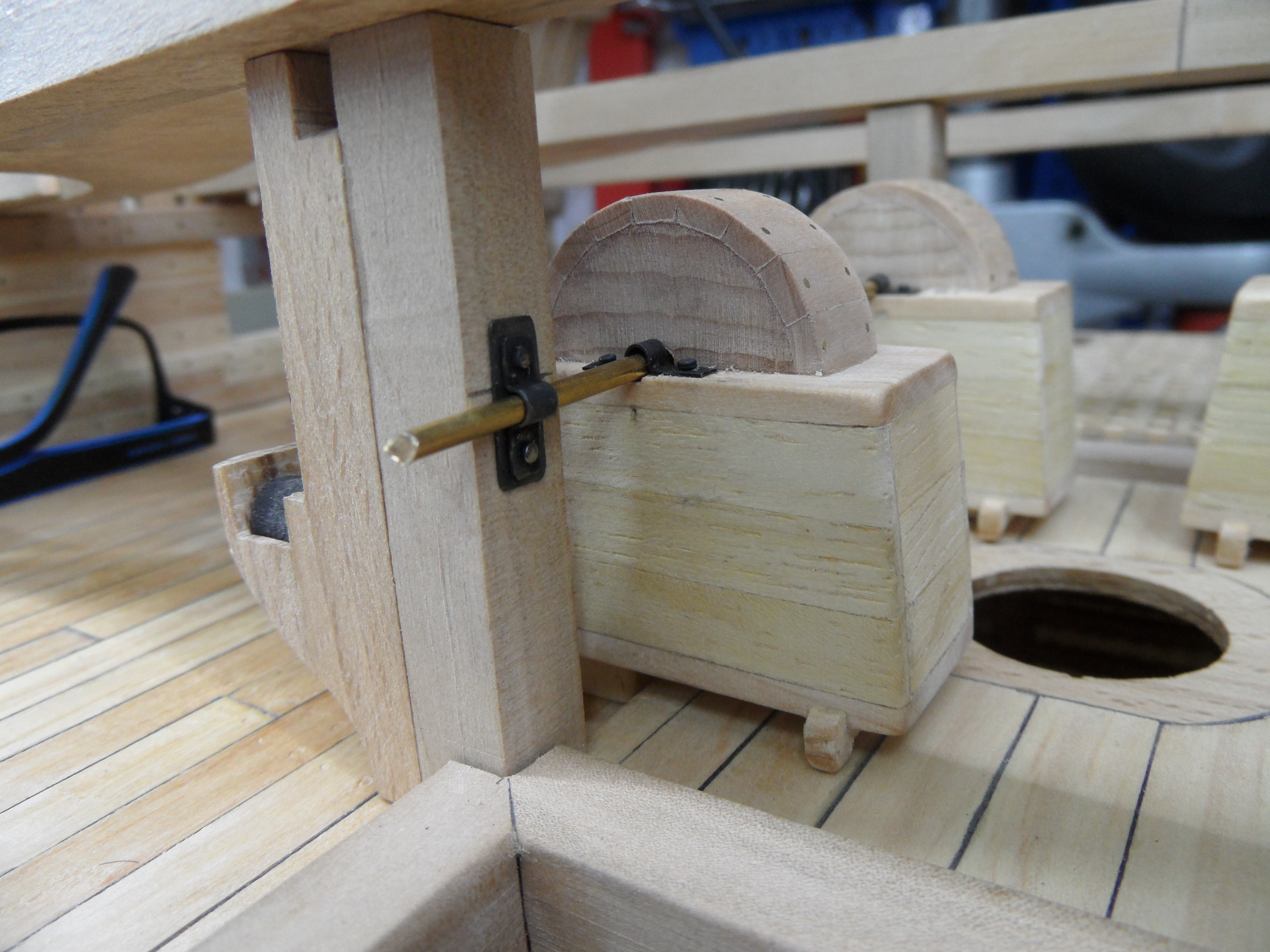 Wykonałem również próbę zmajstrowania uchwytów do korb pomp umieszczonych na belkach podtrzymujących pokładniki wyższego pokładu.