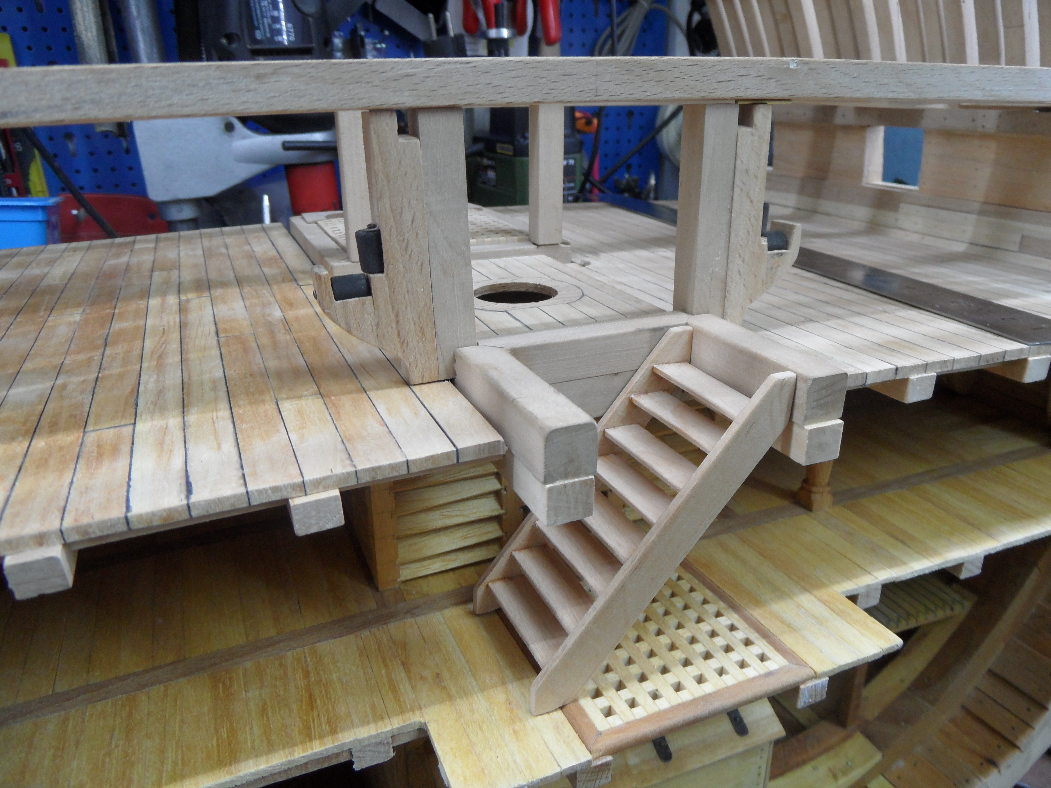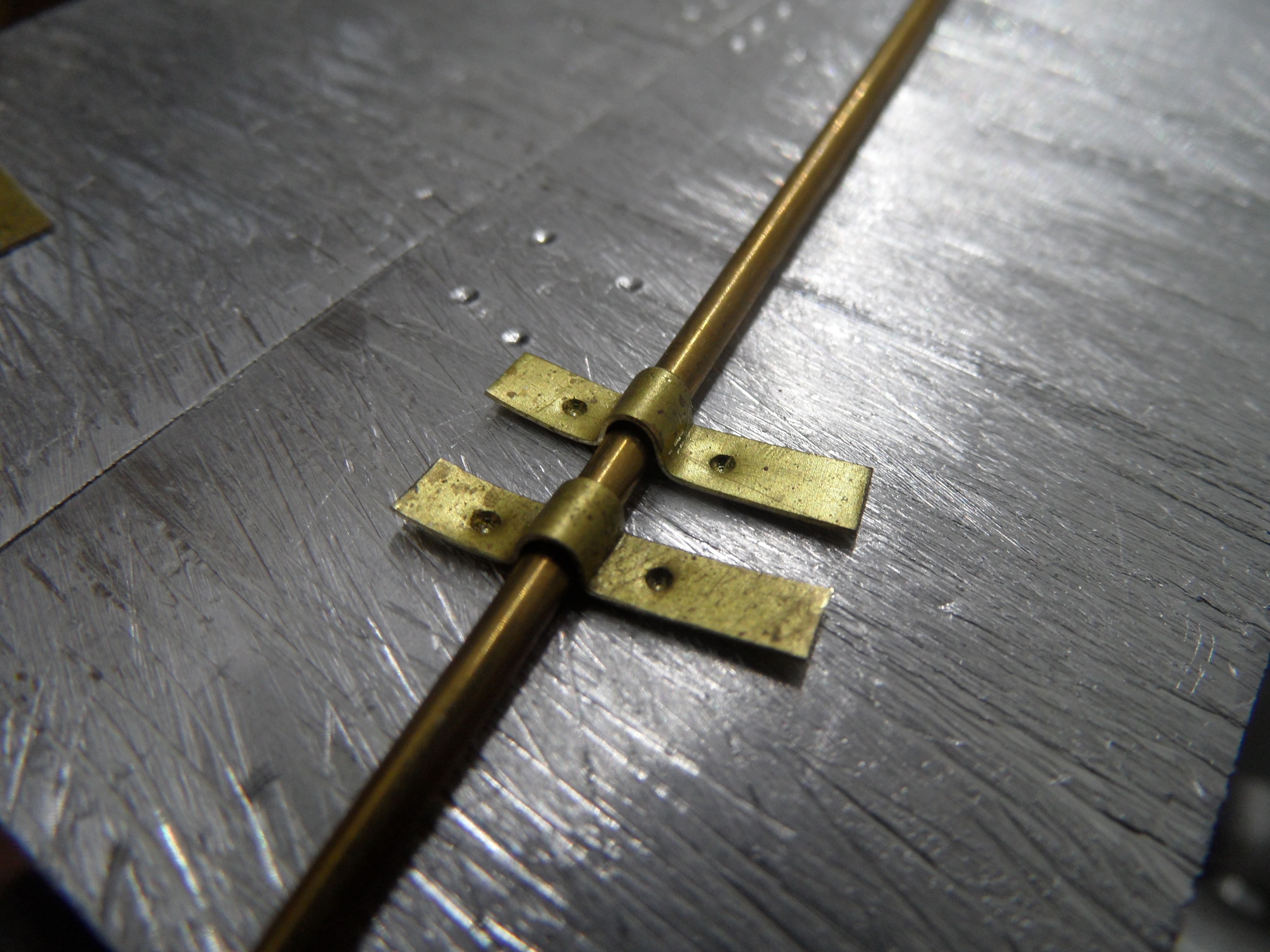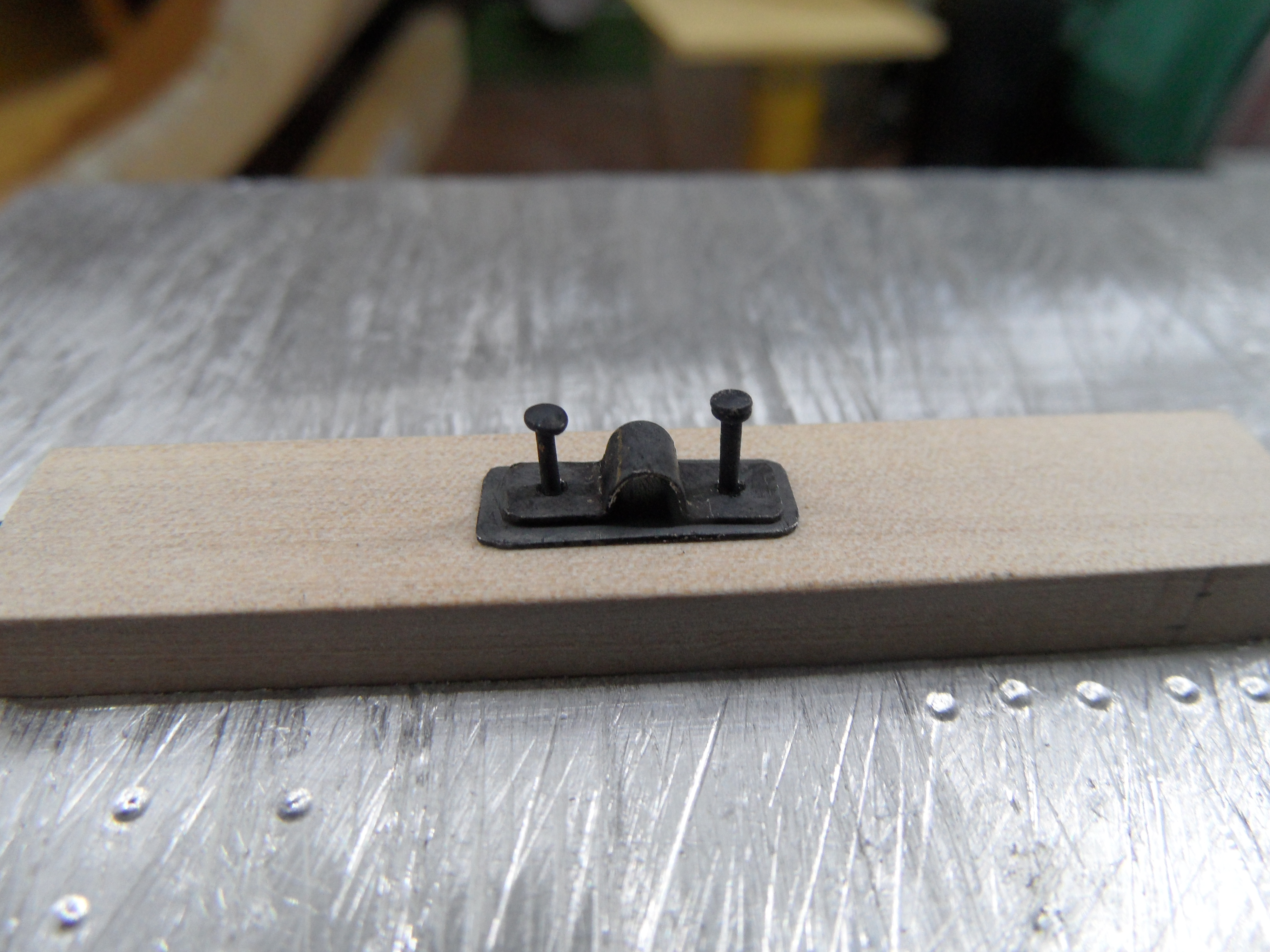 Wykonałem również próbę zmajstrowania uchwytów do korb pomp umieszczonych na belkach podtrzymujących pokładniki wyższego pokładu.