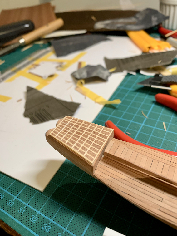 - szykując się do pokładów rufowych oczyma wyobraźni widziałem proste wycięcie forniru, zrobienie intarsji i piękny efekt końcowy. Niestety oczekiwania kontra rzeczywistość zweryfikowały optymistyczne założenie. Przy tak małych elementach fornir nie jest wymarzonym materiałem. poza tym struktura forniru utrudnia zapewnienie gładkiej powierzchni, nie wspominając o powtarzalności geometrycznych elementów. Kombinowałem z frezowaniem forniru i uzupełnianiu rowków szpachlówką drewnianą - efekt słaby, szkoda nawet zdjęć było robić, cięciem lakierowanego forniru i wypełnianiu szpachlówką - dramat.