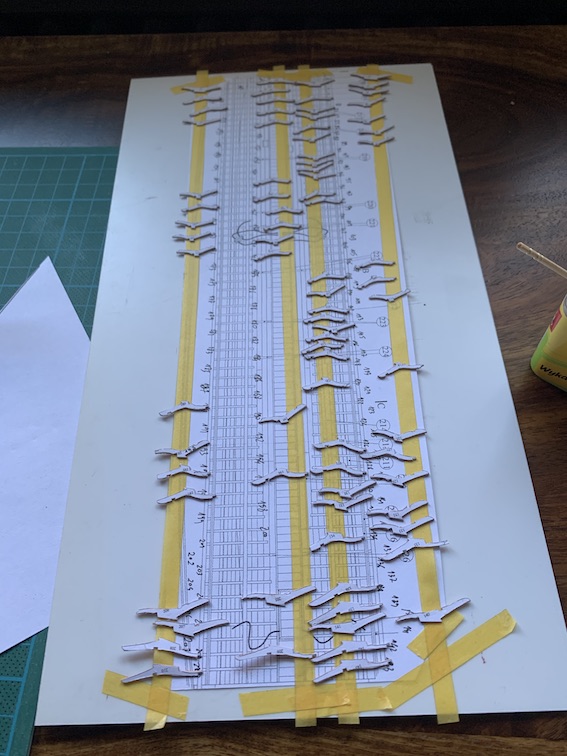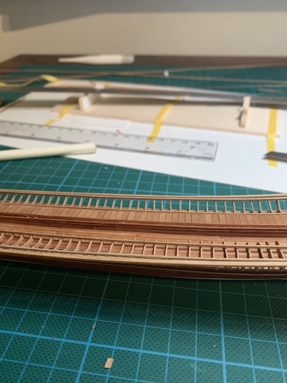 Skrupulatnie powycinałem wsporniki burtowe w liczbie pewnie koło 150. to naprawdę małe drobiazgi i ręczne ich wycinanie nie jest przyjemnością jakąś szczególną. Pomijając, że ciężko się klei na styk elementy o grubości 0,5 mm szczególnie do zapokostawanej powierzchni to linia zewnętrznych końcówek tych wsporników ułożyła się w regularny co prawda ale łuk, a nie linię prostą.