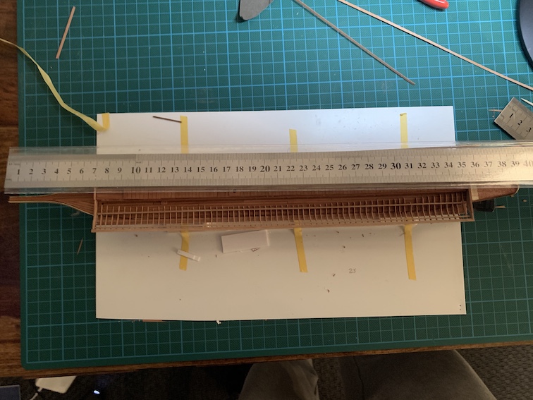 Dla pewności foto z linijką. La Real jako galera de lanterna miała swoje słuszne rozmiary i długość 60 m. Jak mniemam wymiar ten mierzony jest od dziobu do steru (chociaż on był chyba demontowalny). W modelu brak jeszcze tego steru dodającego 0,5 cm. Tak czy inaczej z przeliczenia wychodzi, że model od "ostrogi" do steru winien mieć w skali 1:144 - 41,6 cm a w skali 1:150 - 40 cm.