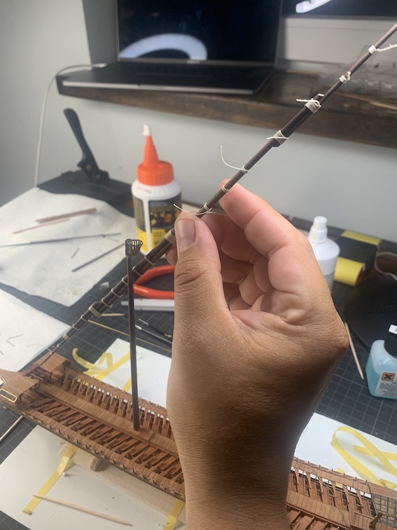 Z masztami natoczyłem się nieco poszczególnych elementów ale to w sumie przyjemna fucha. Ostatecznie będą składane z olinowaniem, przedtem jeszcze pokost i wzmocnienia konstrukcji reji.