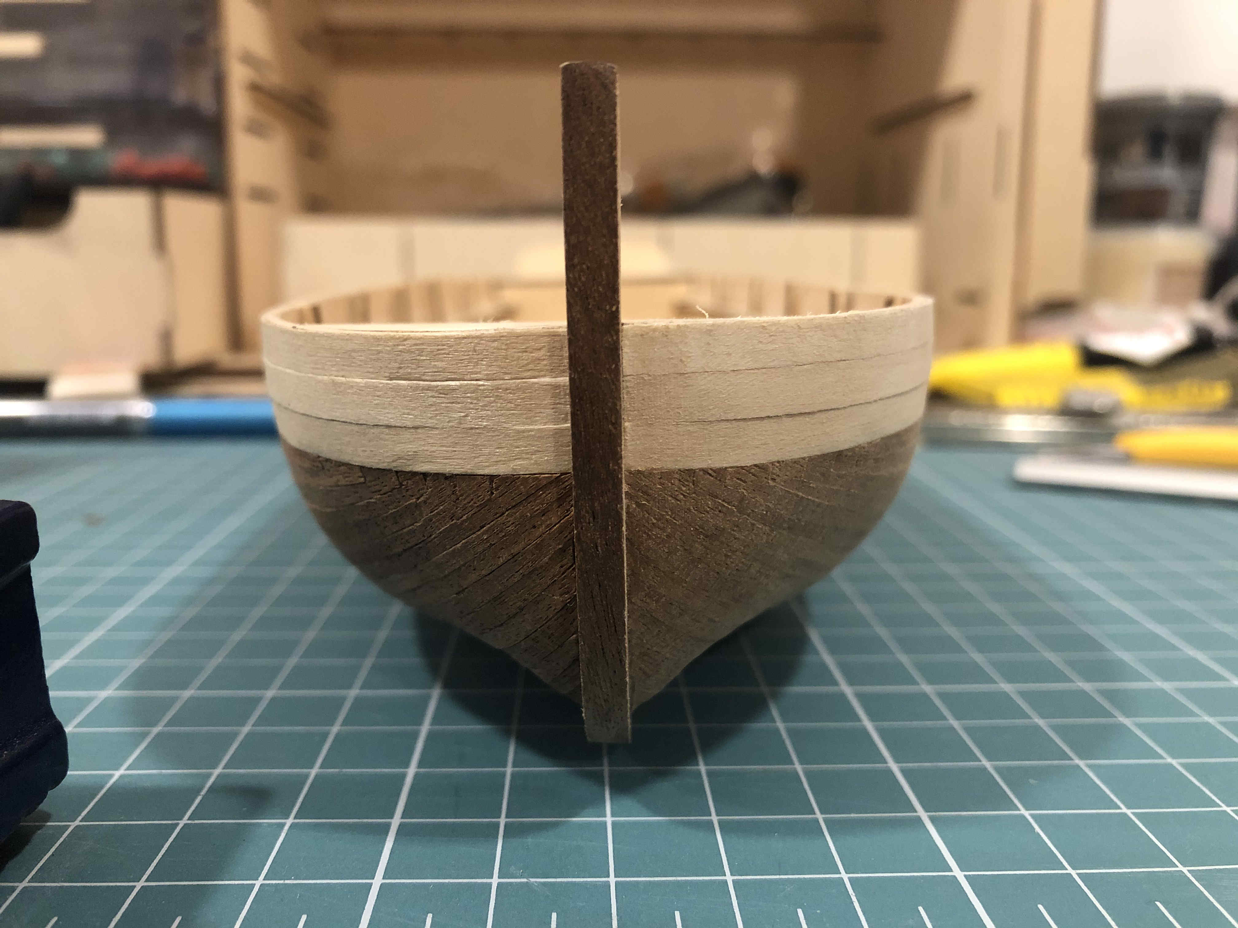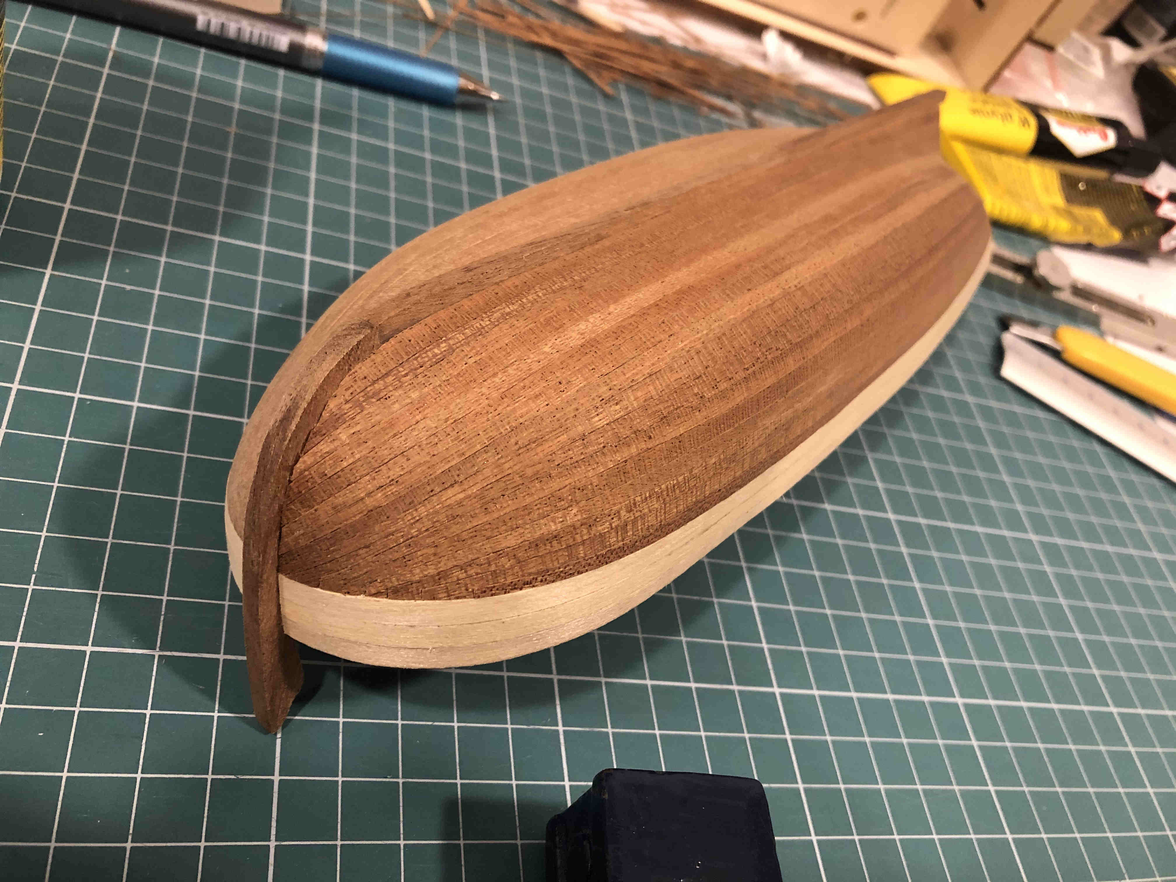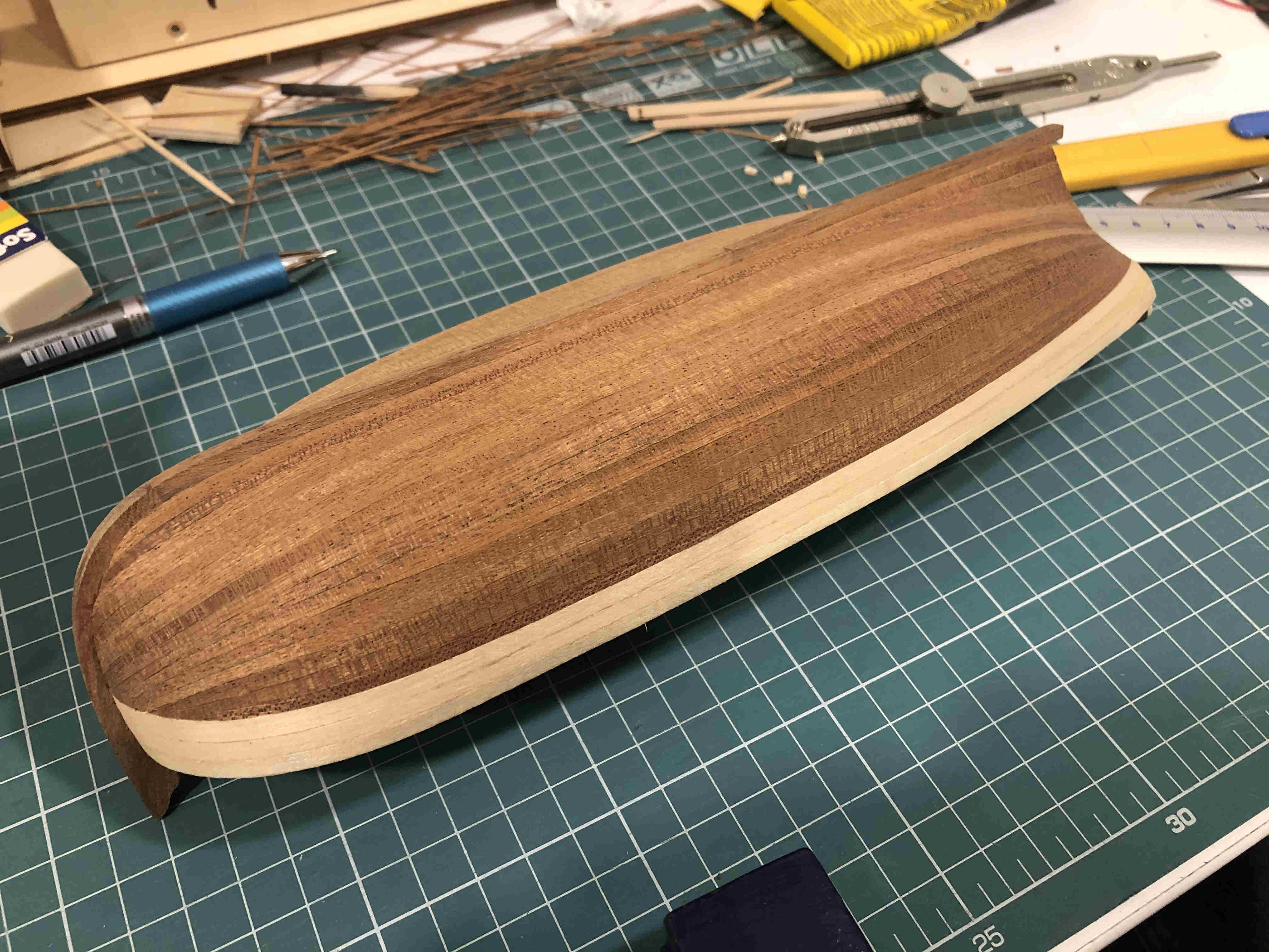 Zdjęcia po skończeniu drugiej warstwy poszycia z forniru. Dostałem w zestawie listewki fornirowe sapelly 0,4mm, pomimo tego, że w instrukcji zostały wspomniane 0,6. Niestety dało się to we znaki, gdyż bardzo się kruszyły na krawędziach podczas szlifowania i cięcia. Ale na moje oko udało się osiągnąć zadowalający efekt. Do kilku szpar musiałem nałożyć kleju zaraz przed szlifowaniem.