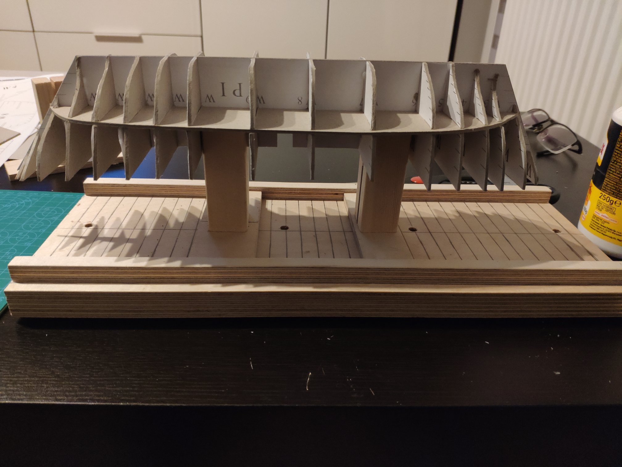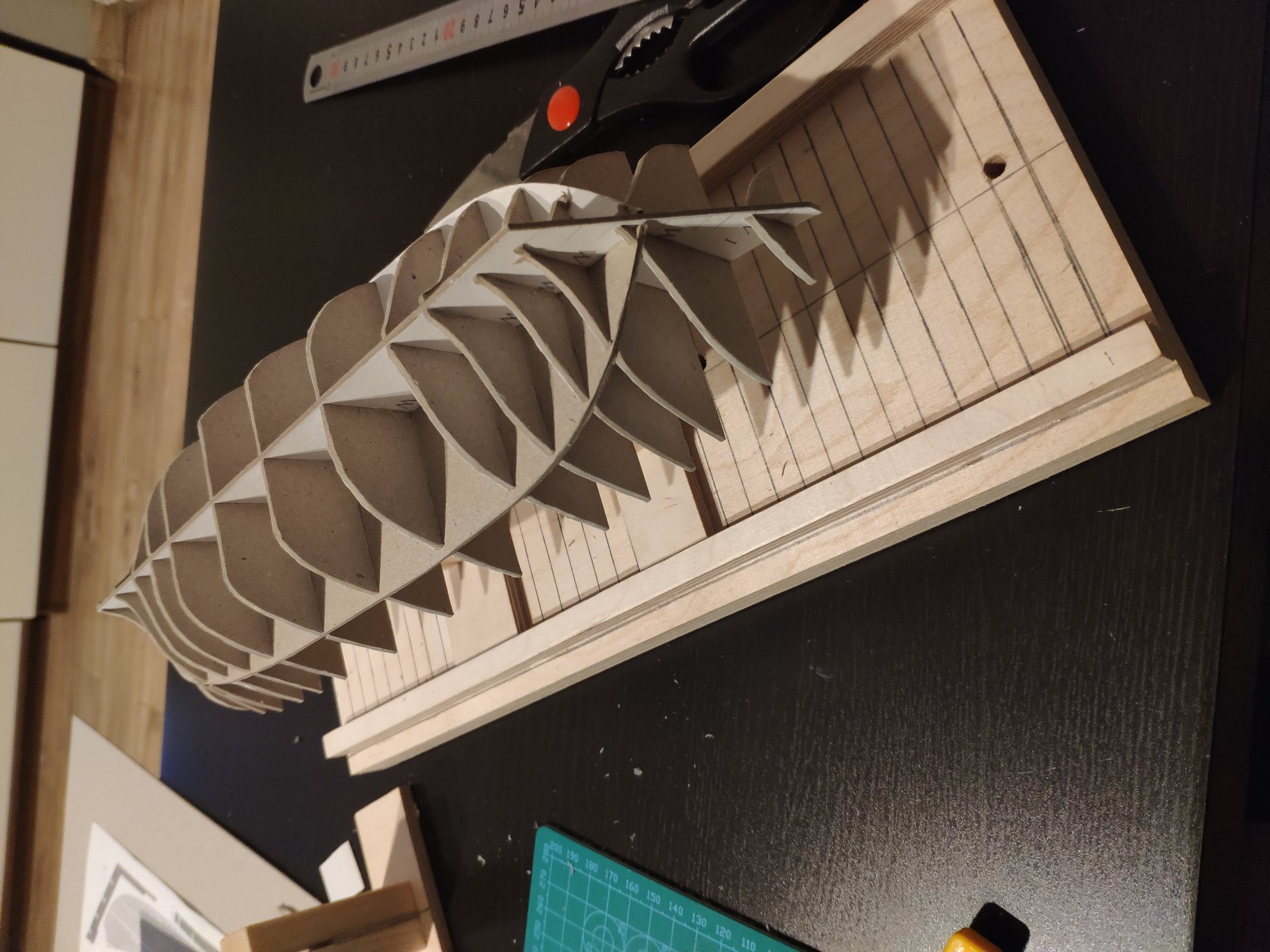 A może te wręgi tak mają być ? Znalazłem wątek kolegi Michała na naszym forum z tym modelem który wyciął wręgi laserowo z MM i ma tak samo http://www.koga.net.pl/forum/viewtopic.php?f=7&t=34758. Tylko jak to pokryć jak jest taki uskok ? Zamówiłem tekturę bo mi brakło i czekam :-) będę próbował to poprawić albo zrobię trzeci szkielet ...